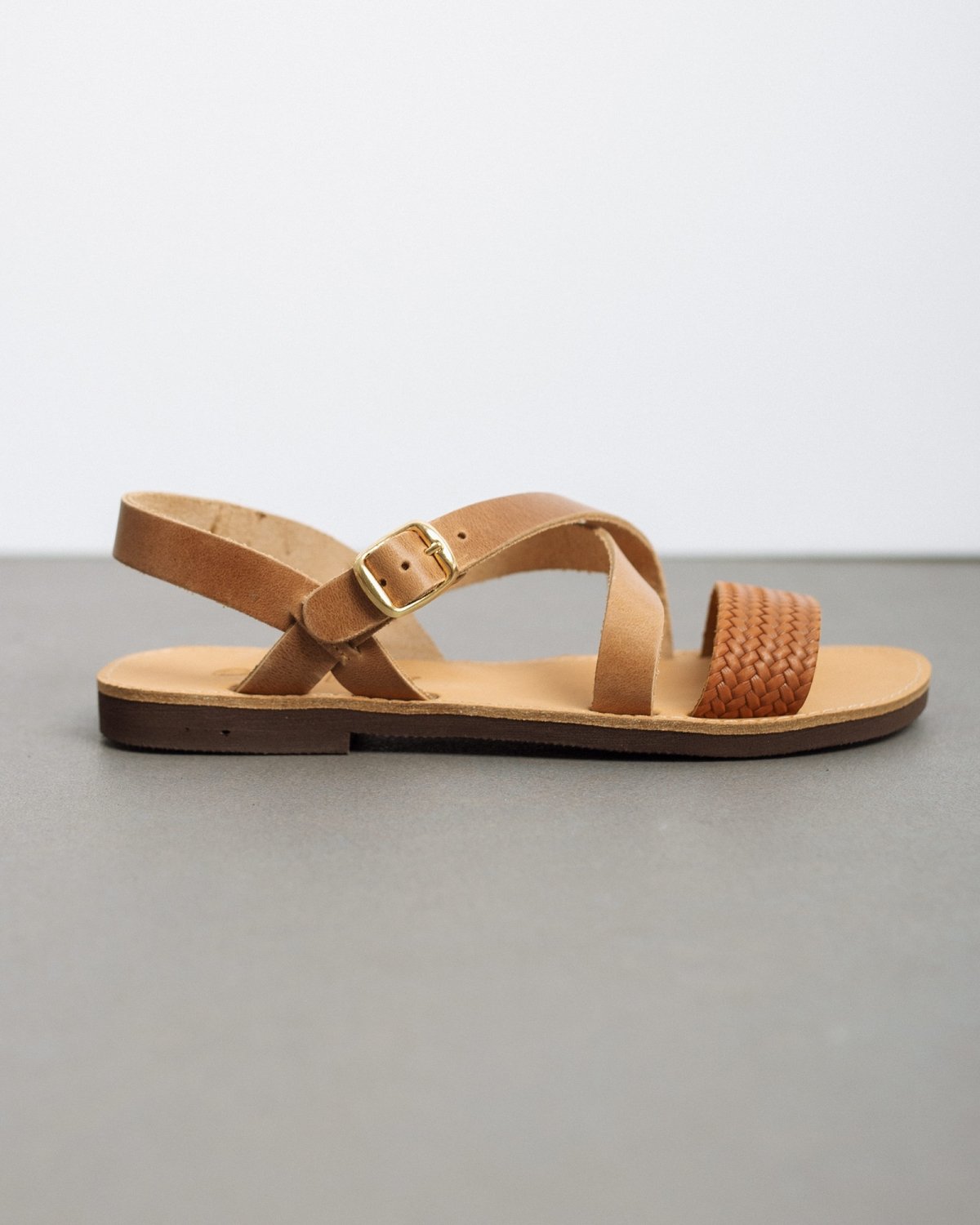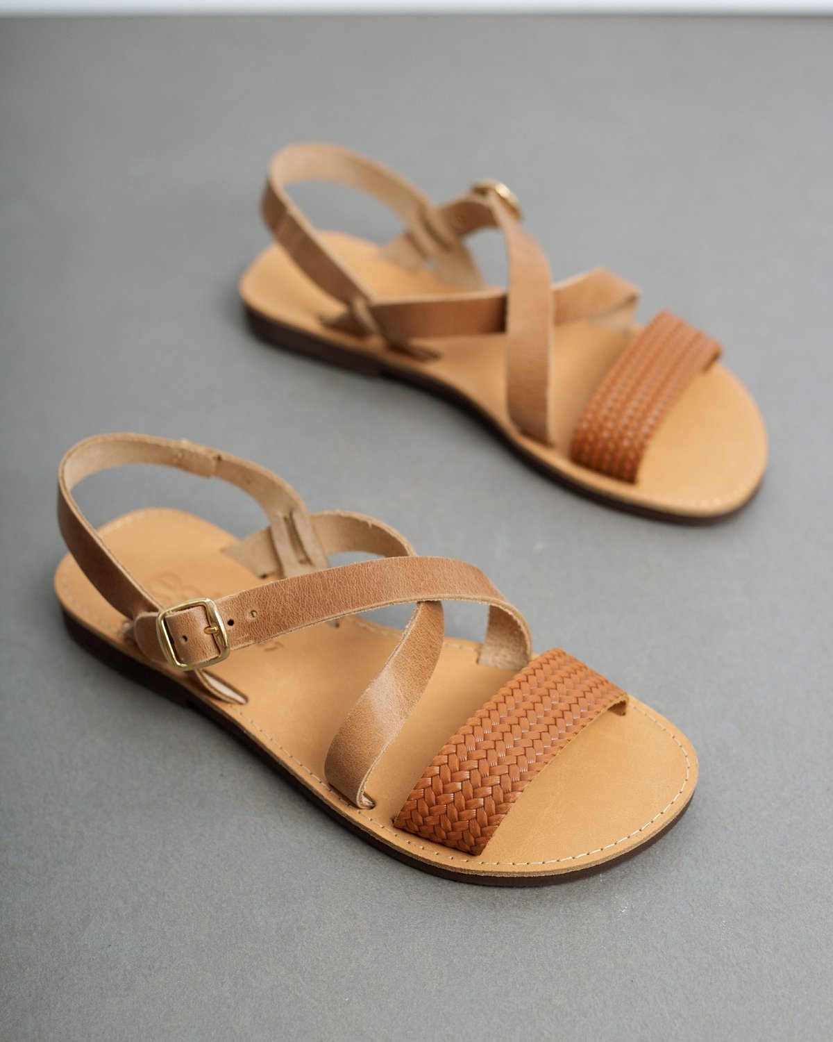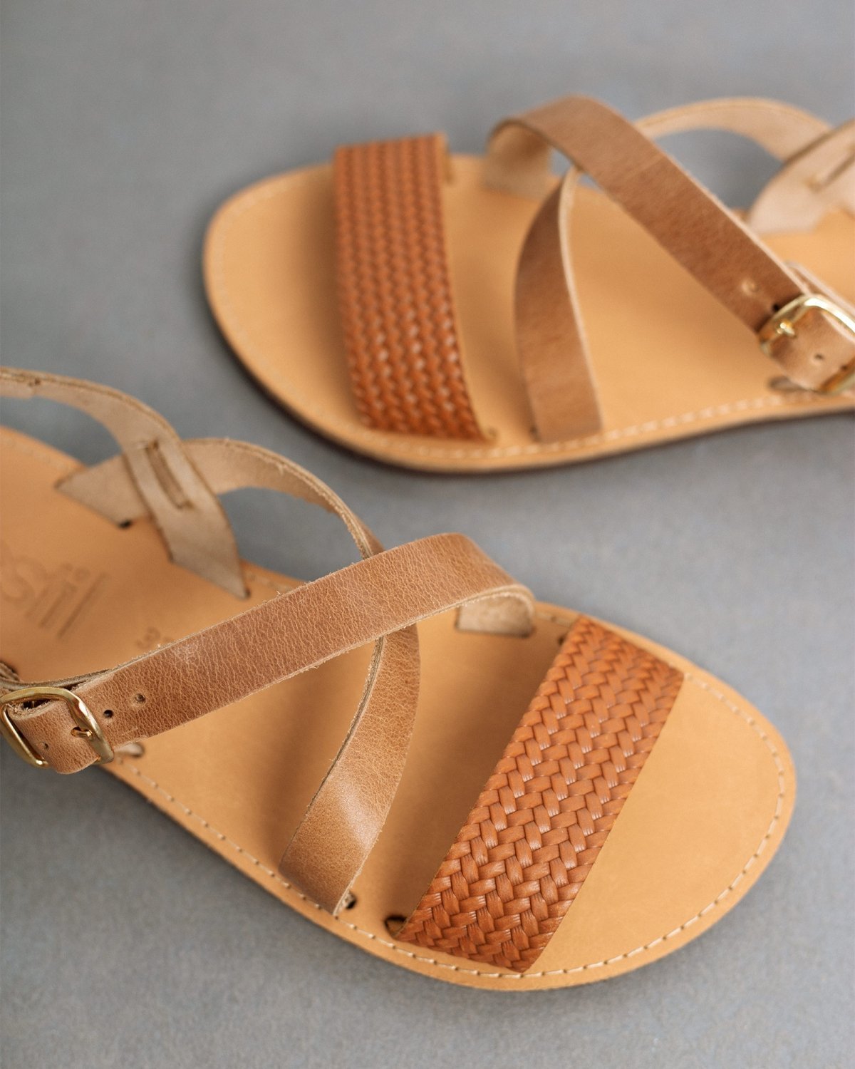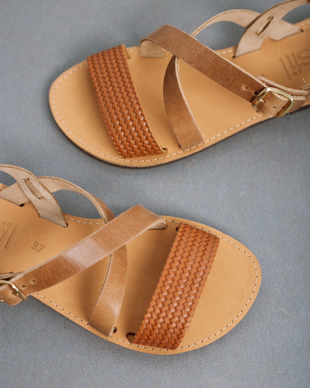 Estil δερμάτινα φλατ σανδάλια με χιαστί λουράκια στο κουτεπιέ. ανάγλυφο μοτίβο ψάθα στη φάσα. Ελληνικής κατασκευής, χειροποίητα.
