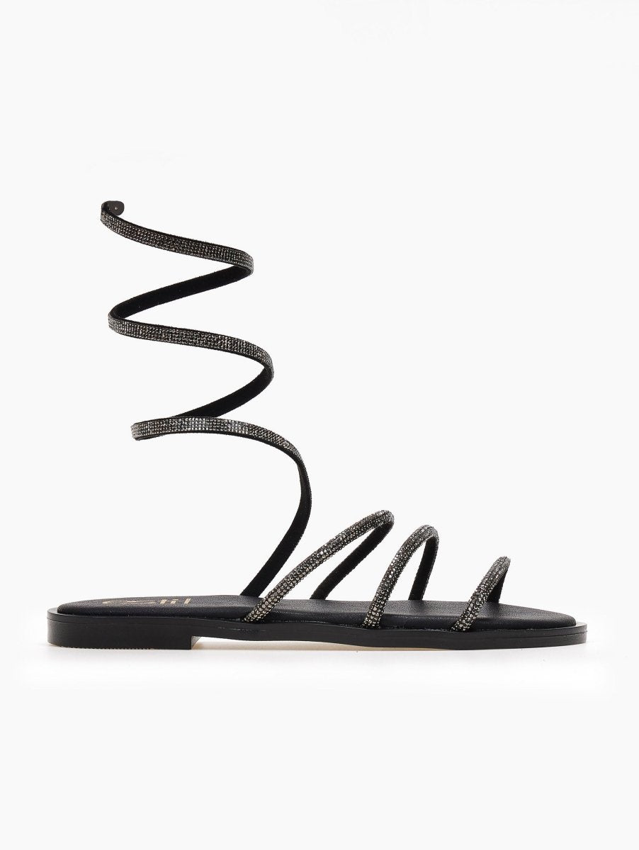 Σανδάλια δερμάτινα estil. έλασμα με στρας στο ύψος της γάμπας. Λεπτά λουράκια με στρας. Πάτος με ενίσχυση. Ελληνικής κατασκευής.