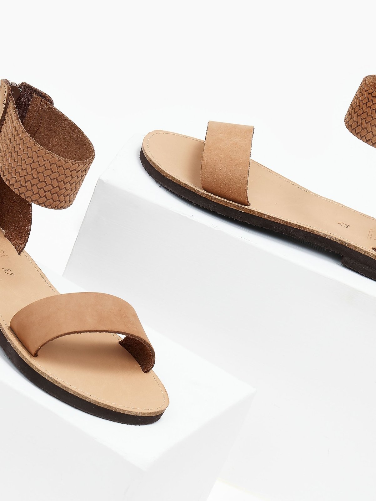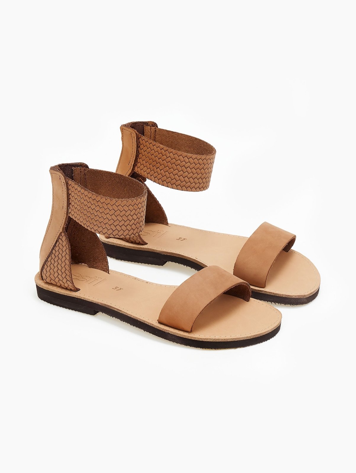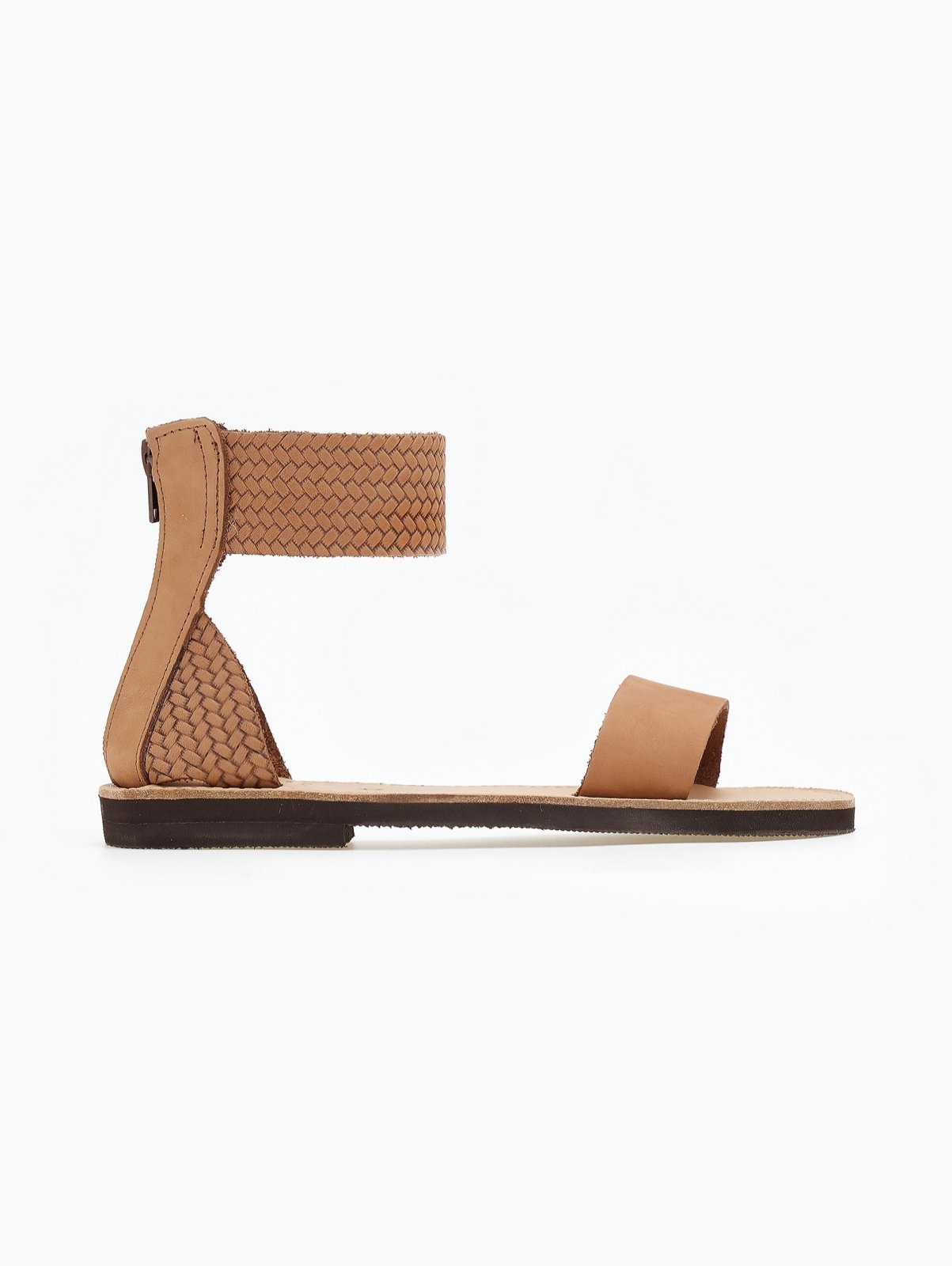 Σανδάλια δερμάτινα estil. Φαρδιά φάσα από δέρμα nubuck. Δένουν στο ύψος του αστραγάλου με φαρδιά μπαρέτα από πλεκτό μοτίβο. Κλείνουν στο πίσω μέρος με φερμουάρ. Ελληνικής κατασκευής,χειροποίητα.