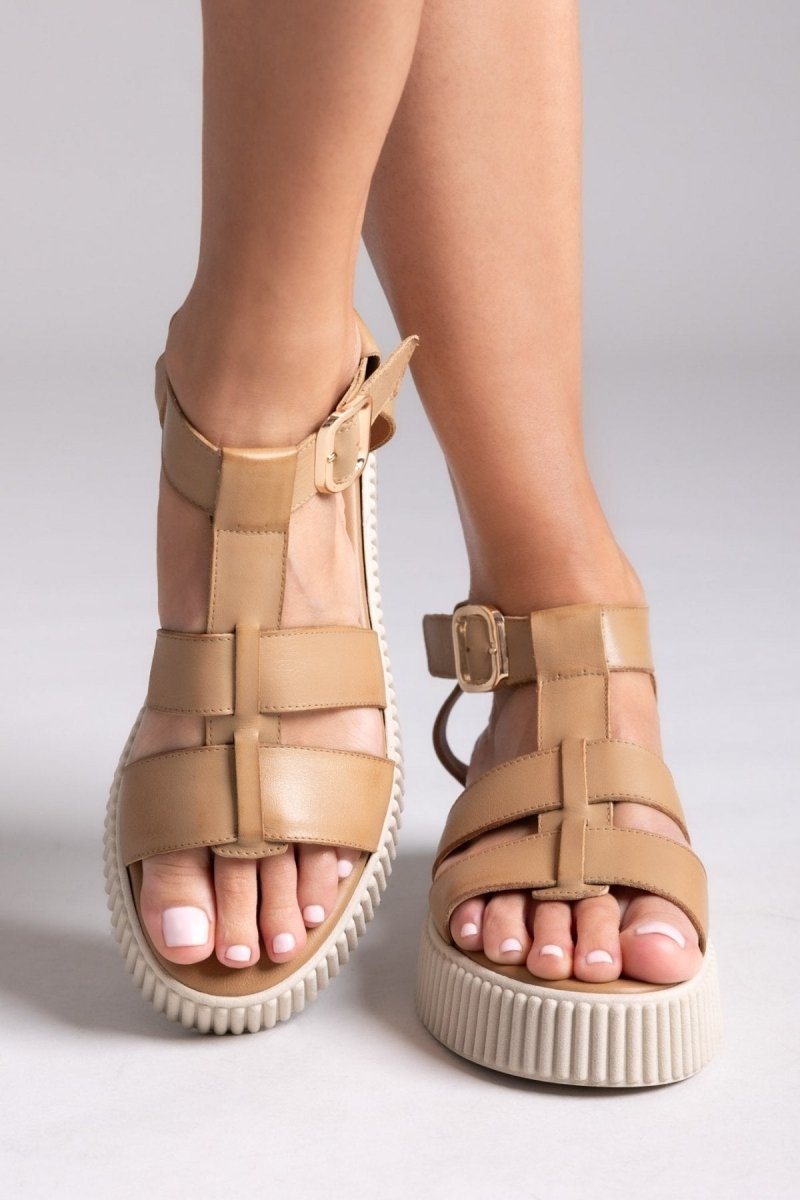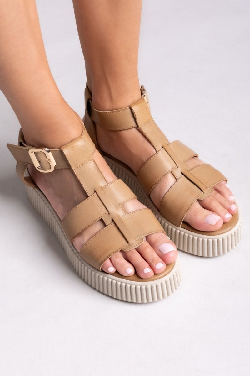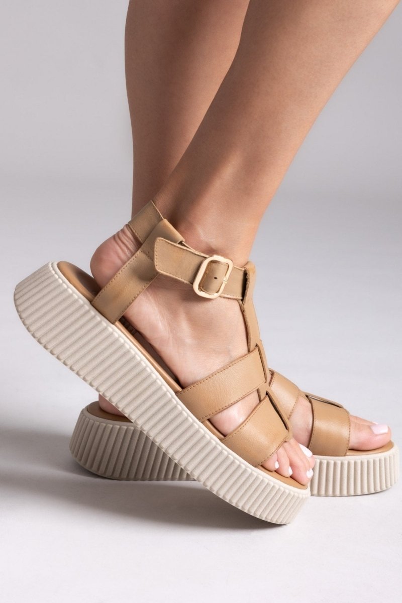 Σανδάλια δερμάτινα flatforms με τοκά TFP - Μπεζ