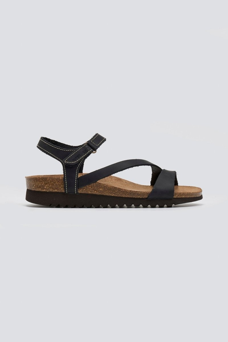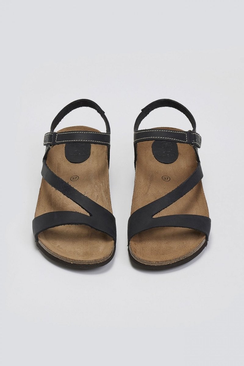 Σανδάλια από γνήσιο δέρμα Interbios. Σχέδιο με λοξό λουράκι στο κουτεπιέ. Δένουν με μπαρέτα και velcro κλείσιμο στο ύψος του αστραγάλου. Πάτος από δέρμα καστόρι με ανατομικό σχήμα. Σόλα fusberg από latex φελλό. Made in Spain.