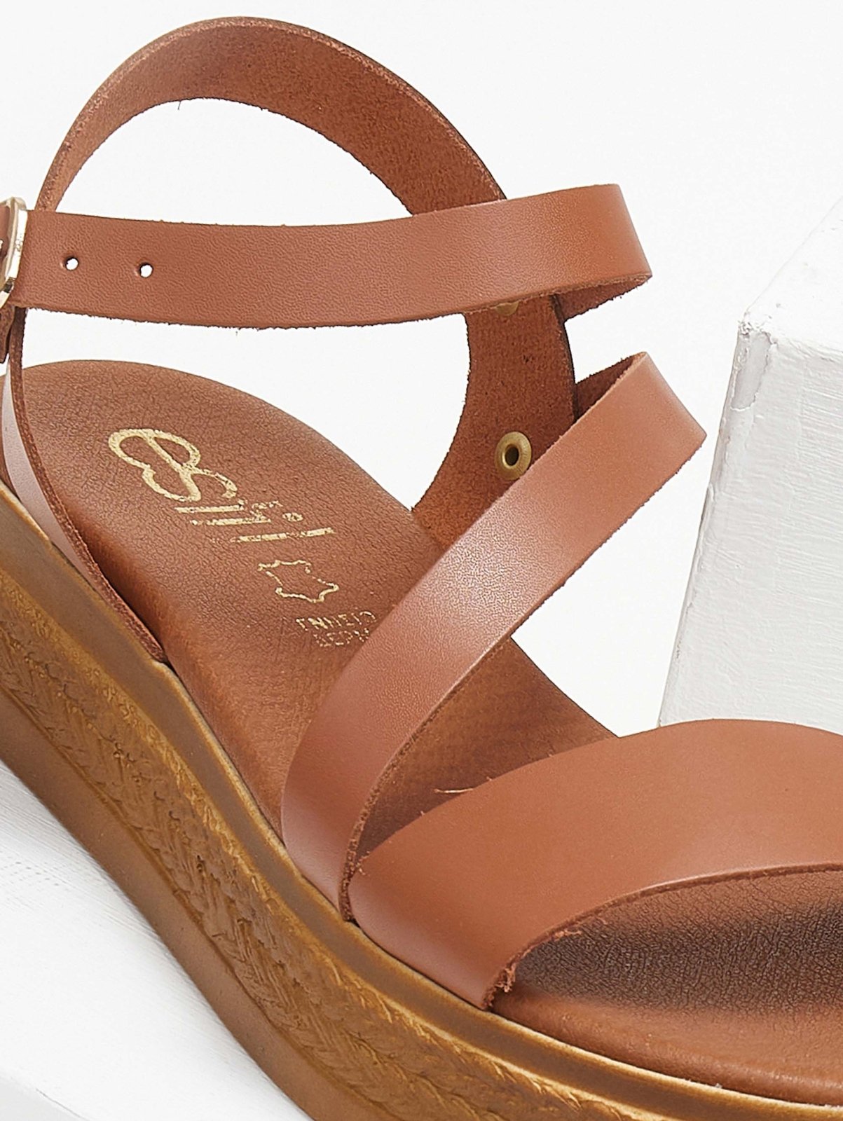 Flatforms σανδάλια δερμάτινα estil. Σχέδιο με λοξό λουράκι στο κουτεπιέ. Δένουν με μπαρέτα στο ύψος του αστραγάλου.
