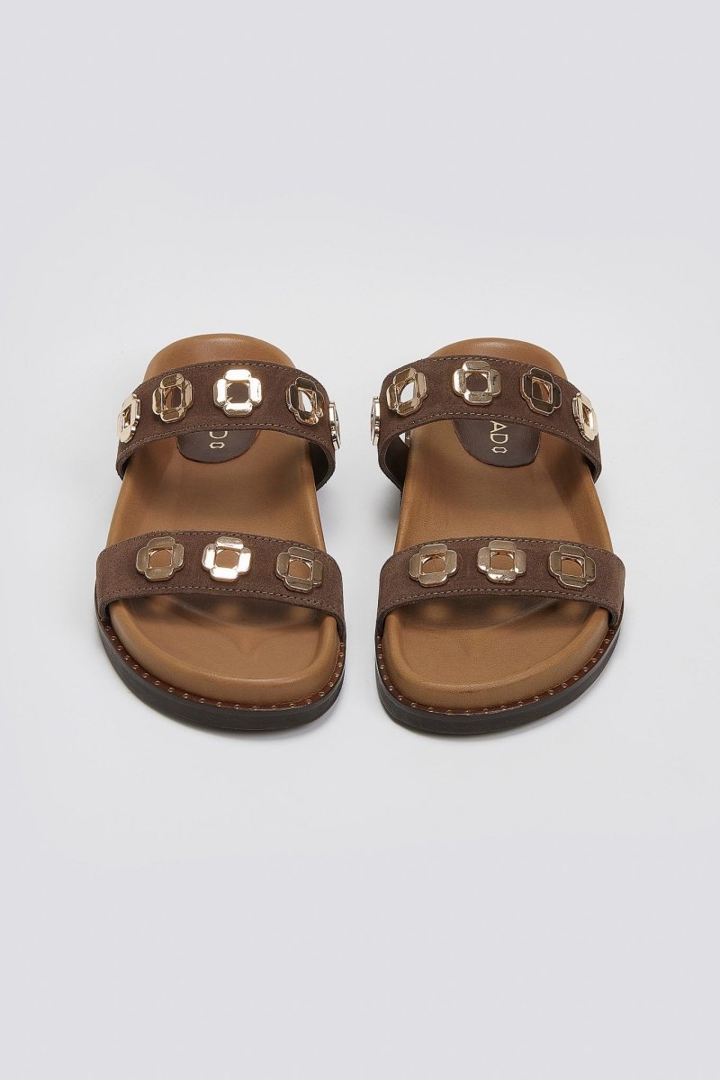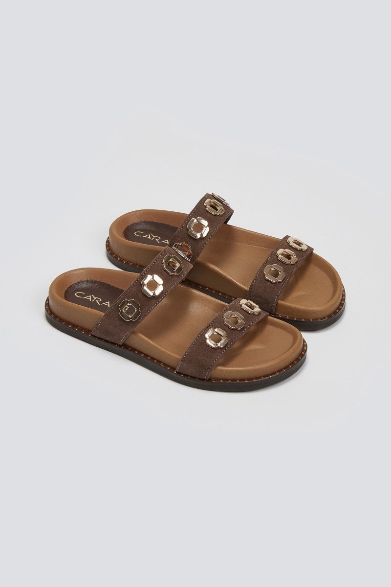 Σανδάλια flatforms από γνήσιο δέρμα καστόρι Carad. Φάσες με μεταλλικά στοιχεία. Πάτος με ανατομικό σχήμα. Ελληνικής κατασκευής.