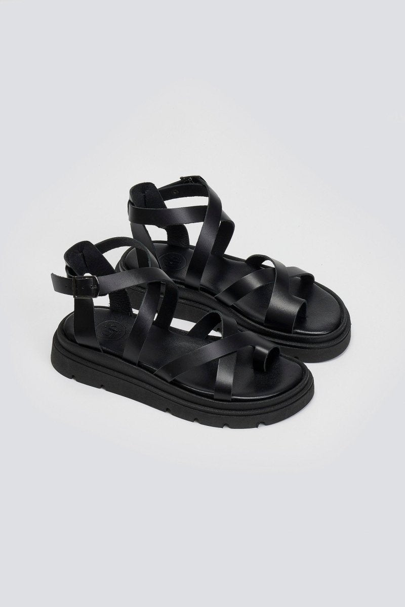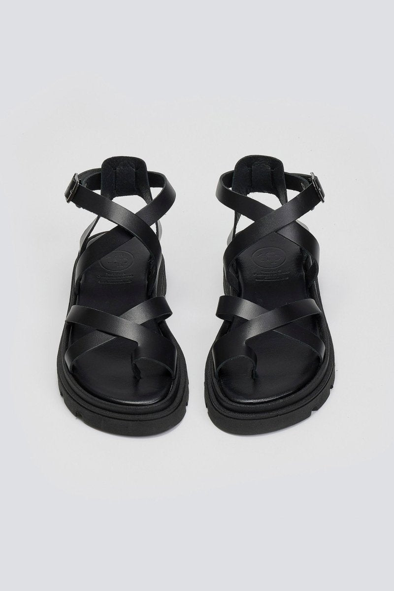 Flarforms δερμάτινα σανδάλια Tfp. Σχέδιο με δάκτυλο και crossover λουράκια στο κουτεπιέ. Δένουν με μπαρέτας το ύψος του αστραγάλου. Μαλακός δερμάτινος πάτος με ενίσχυση. Ελληνικής κατασκευής.