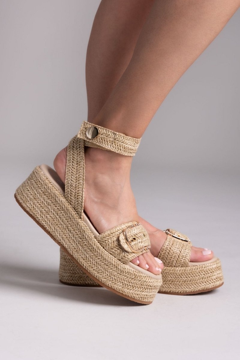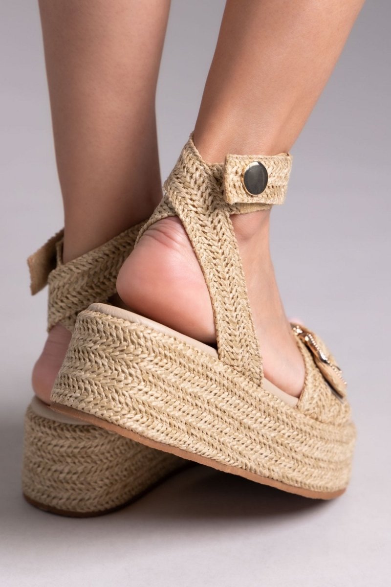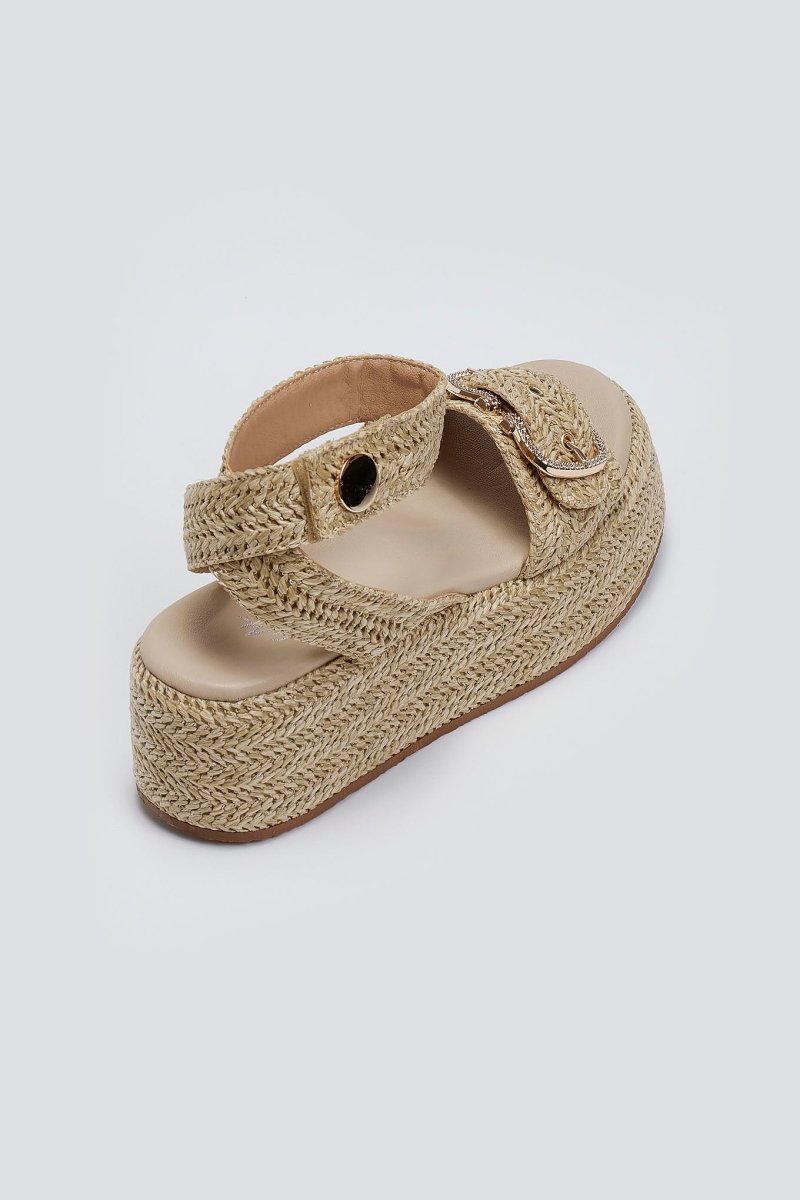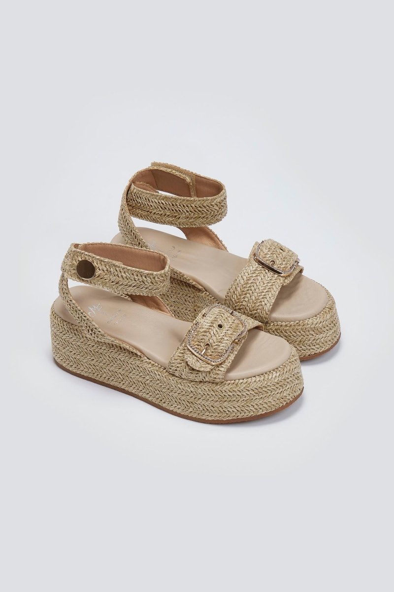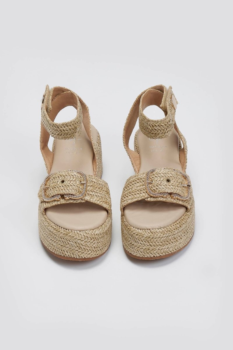 Σανδάλια flatforms από ψάθα Mariella Fabiani. Φάσα με μεταλλικό τοκά. Μπαρέτα με velcro αυτοκόλητο και μεταλλική λεπτομέρεια. Μαλακός πάτος με ενίσχυση.