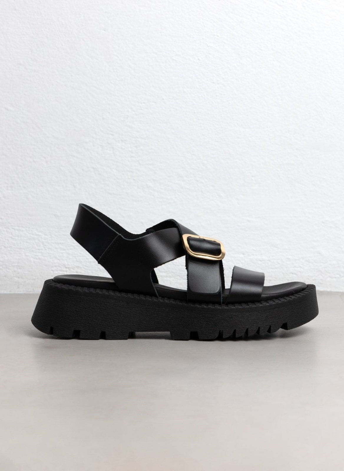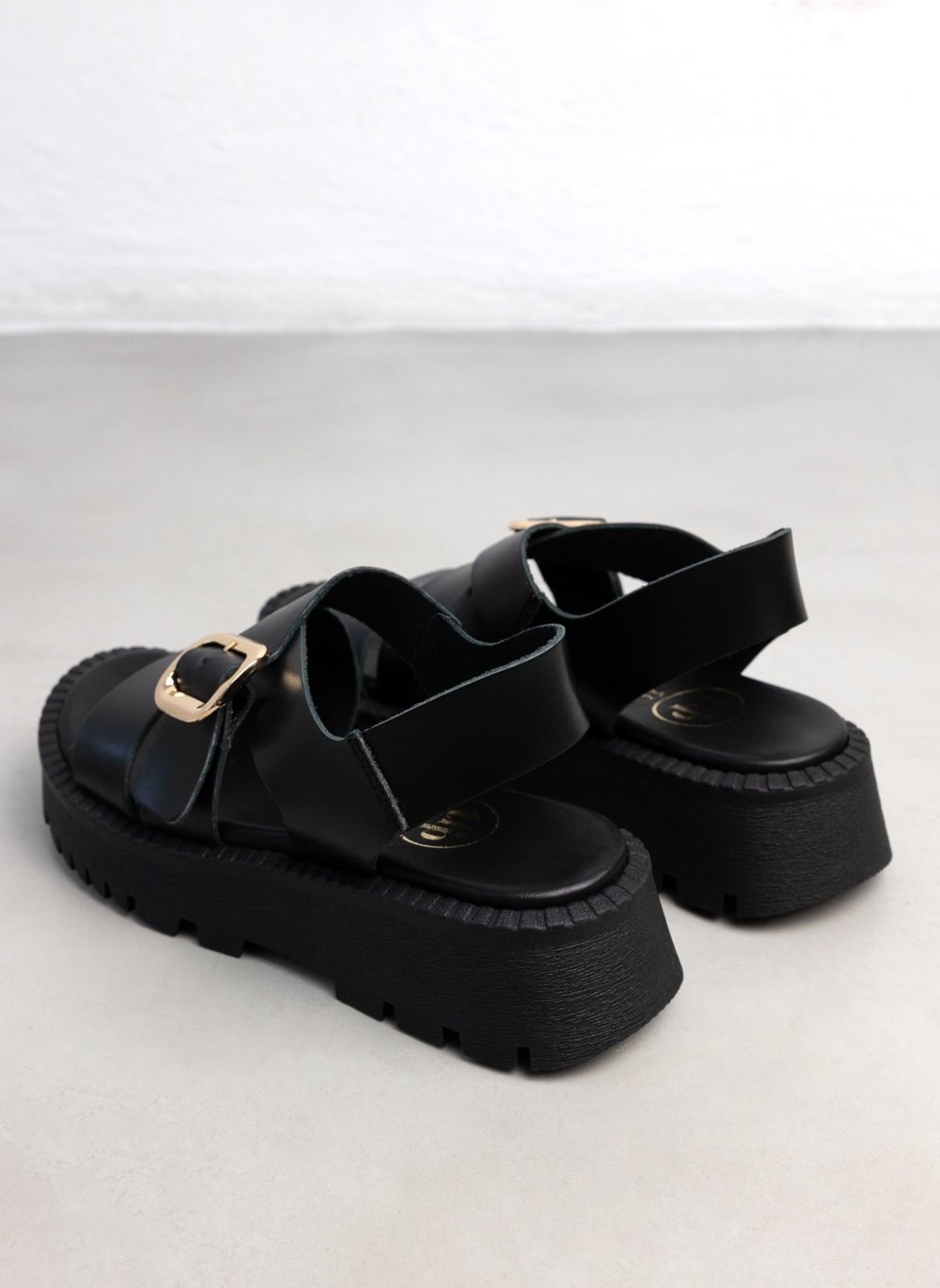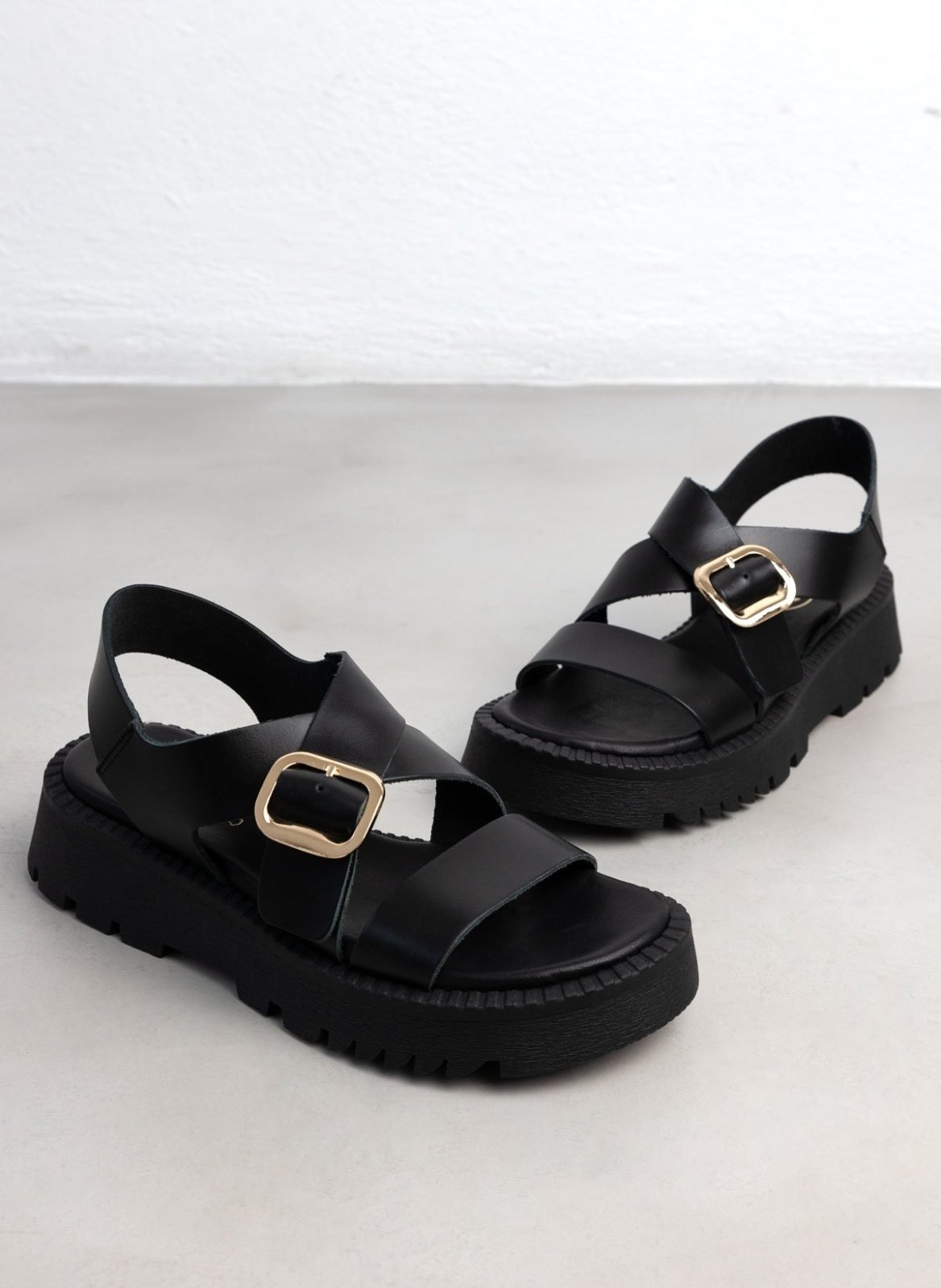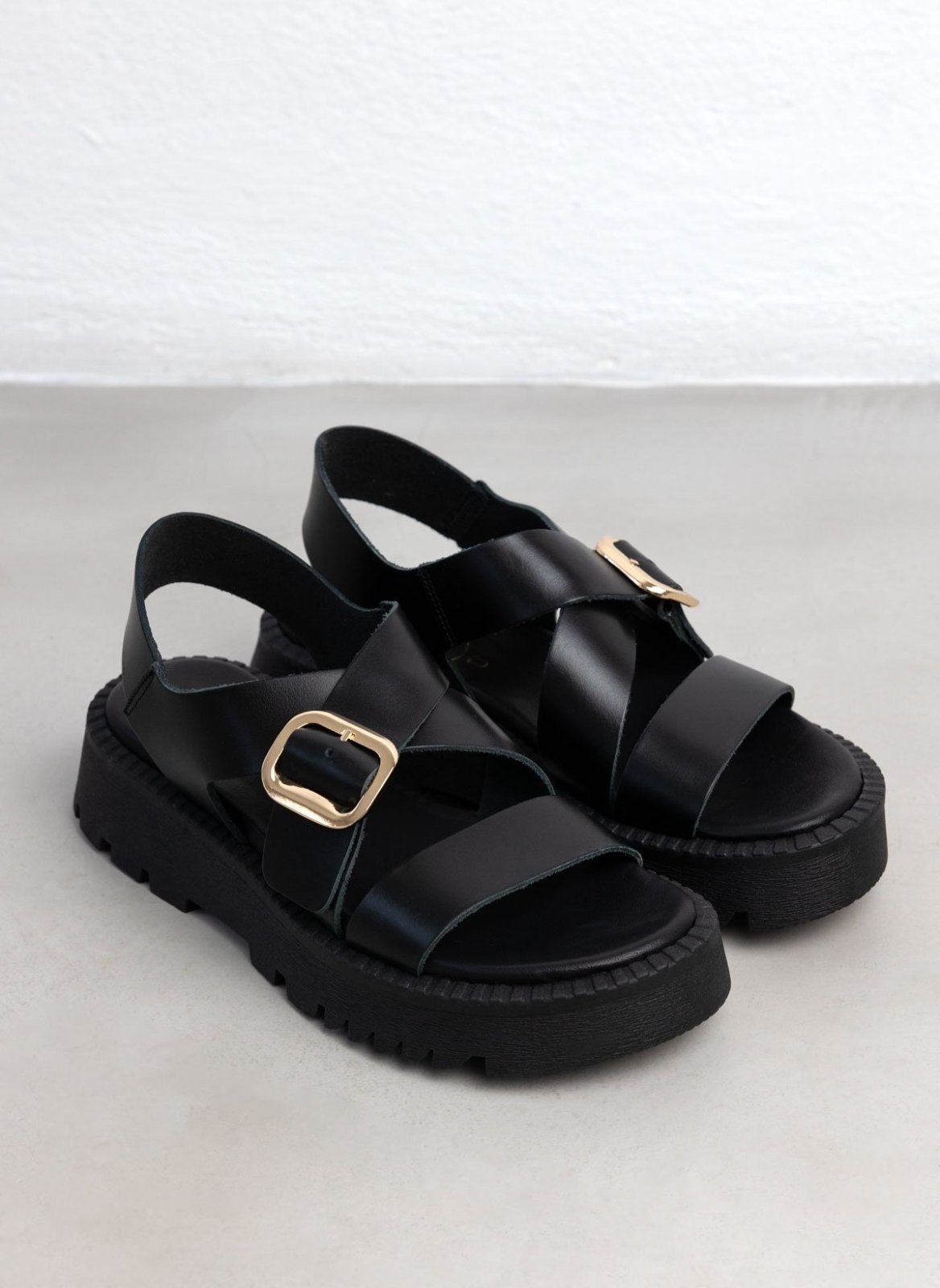 Σανδάλια flatforms δερμάτινα crossover TFP. Λεπτή φάσα μπροστά. Μαλακός πάτος με ενίσχυση. Κλείνουν με μεταλλικό τοκά στο ύψος του κουτεπιέ. Τρακτερωτή σόλα. Ελληνικής κατασκευής.