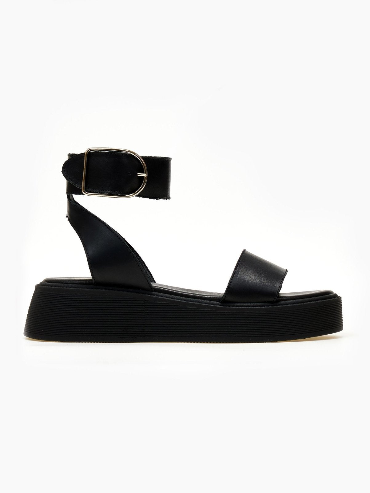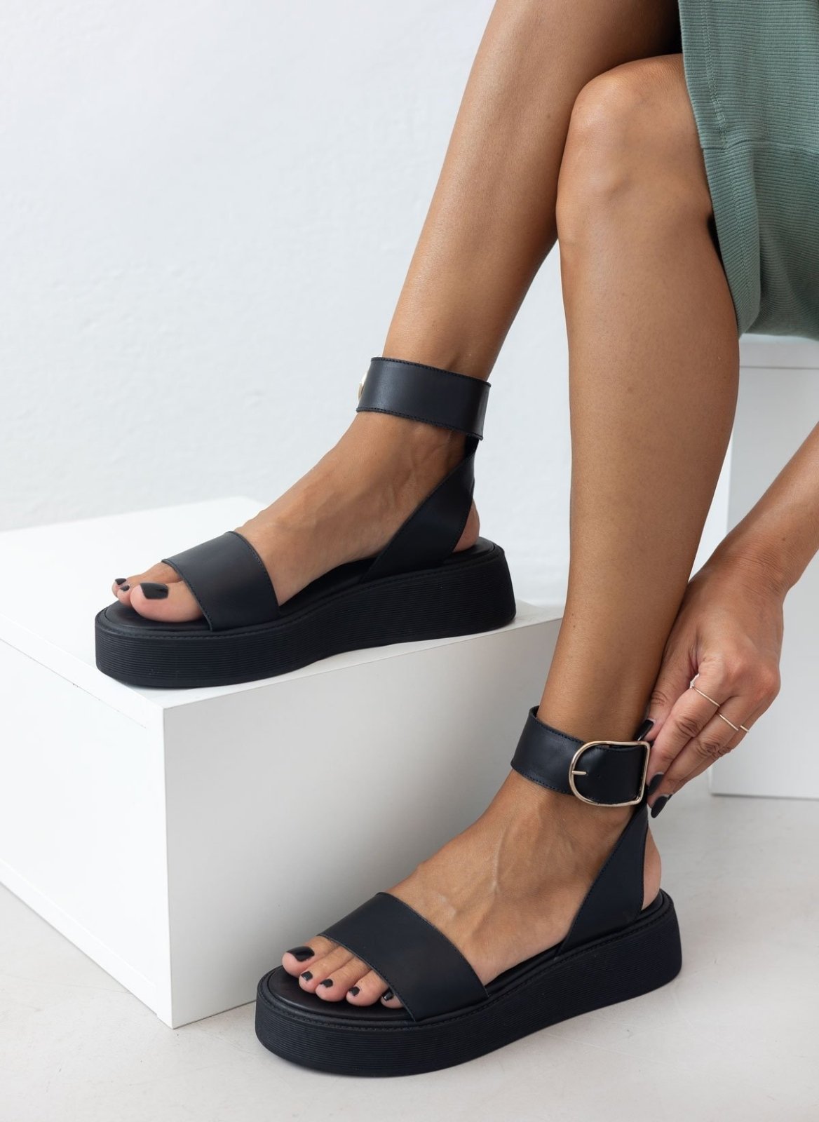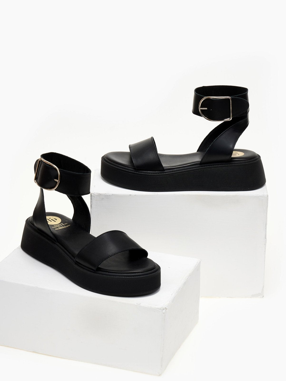 Σανδάλια flatforms δερμάτινα TFP. Δένουν με μπαρέτα στο ύψος του αστραγάλου. Λεπτός oversize τοκάς στο πλάι. Μαλακός δερμάτινος πάτος με ενίσχυση. Ελληνικής κατασκευής.