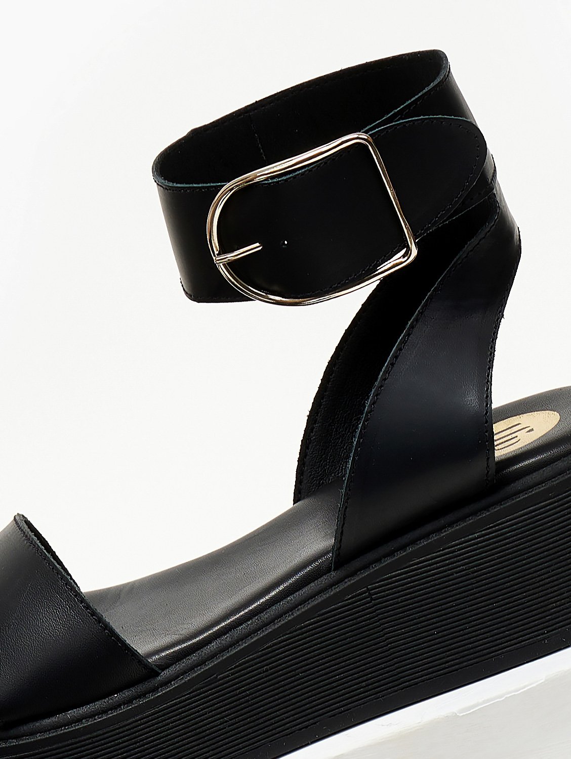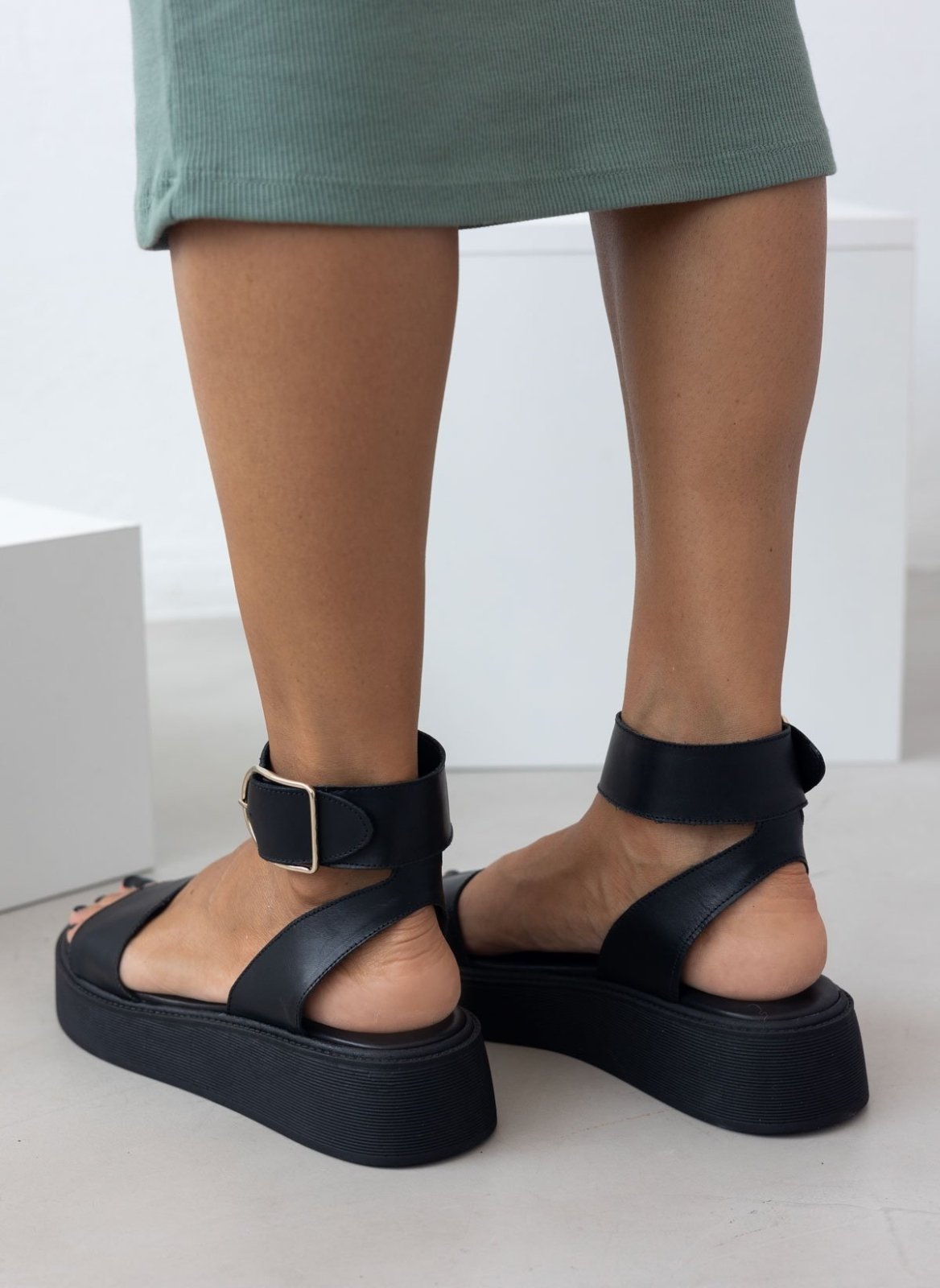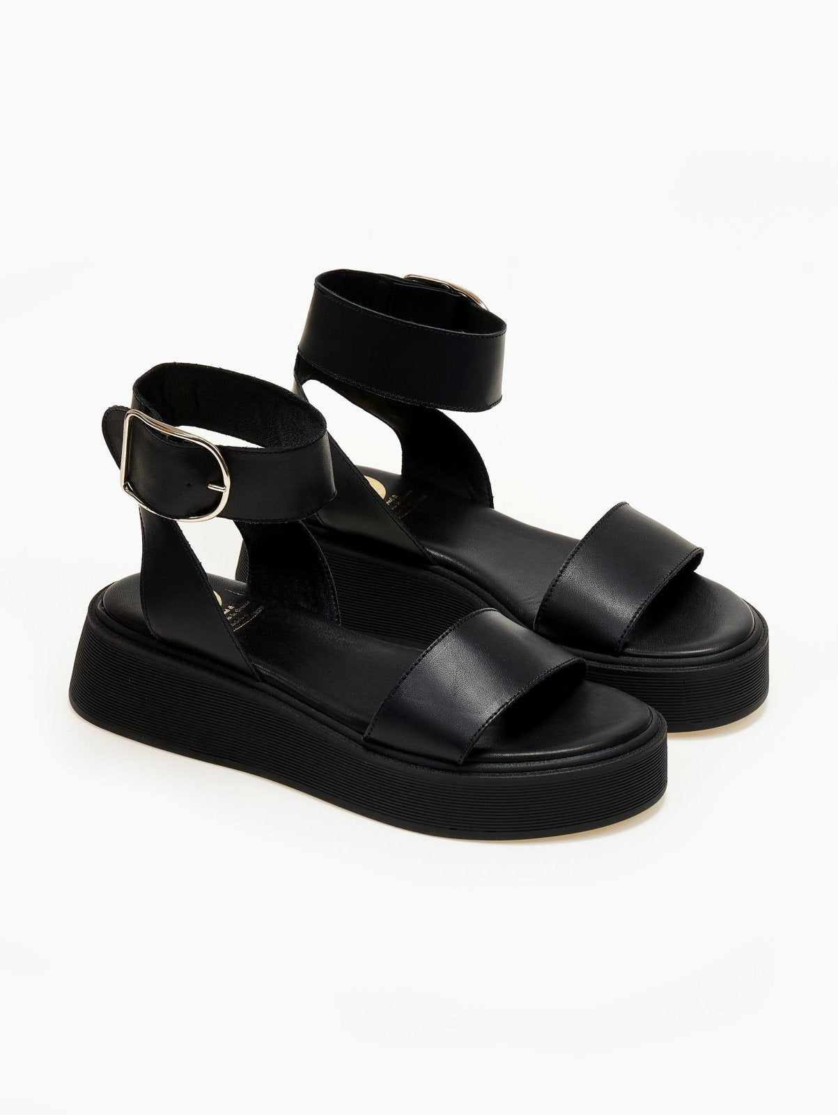 Σανδάλια flatforms δερμάτινα TFP. Δένουν με μπαρέτα στο ύψος του αστραγάλου. Λεπτός oversize τοκάς στο πλάι. Μαλακός δερμάτινος πάτος με ενίσχυση. Ελληνικής κατασκευής.