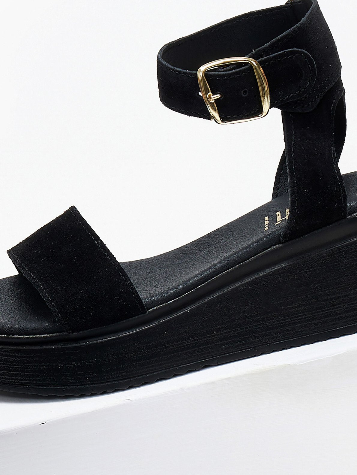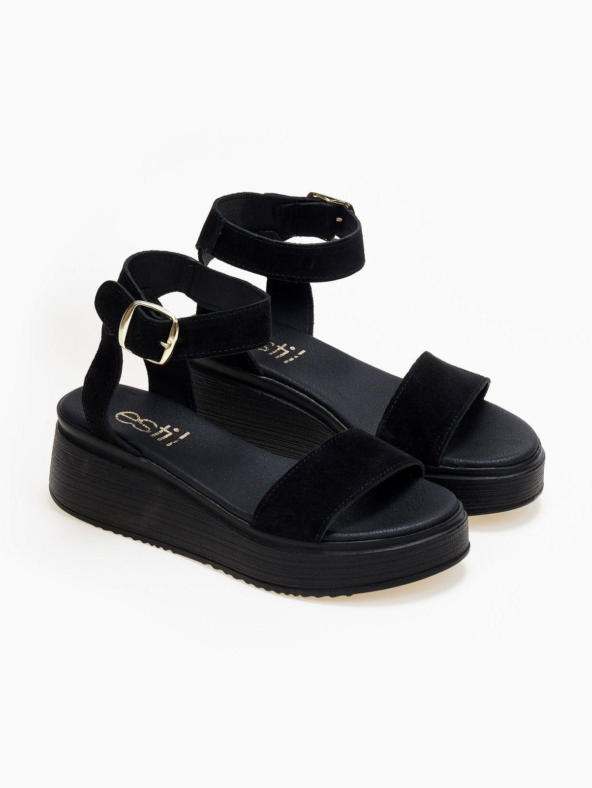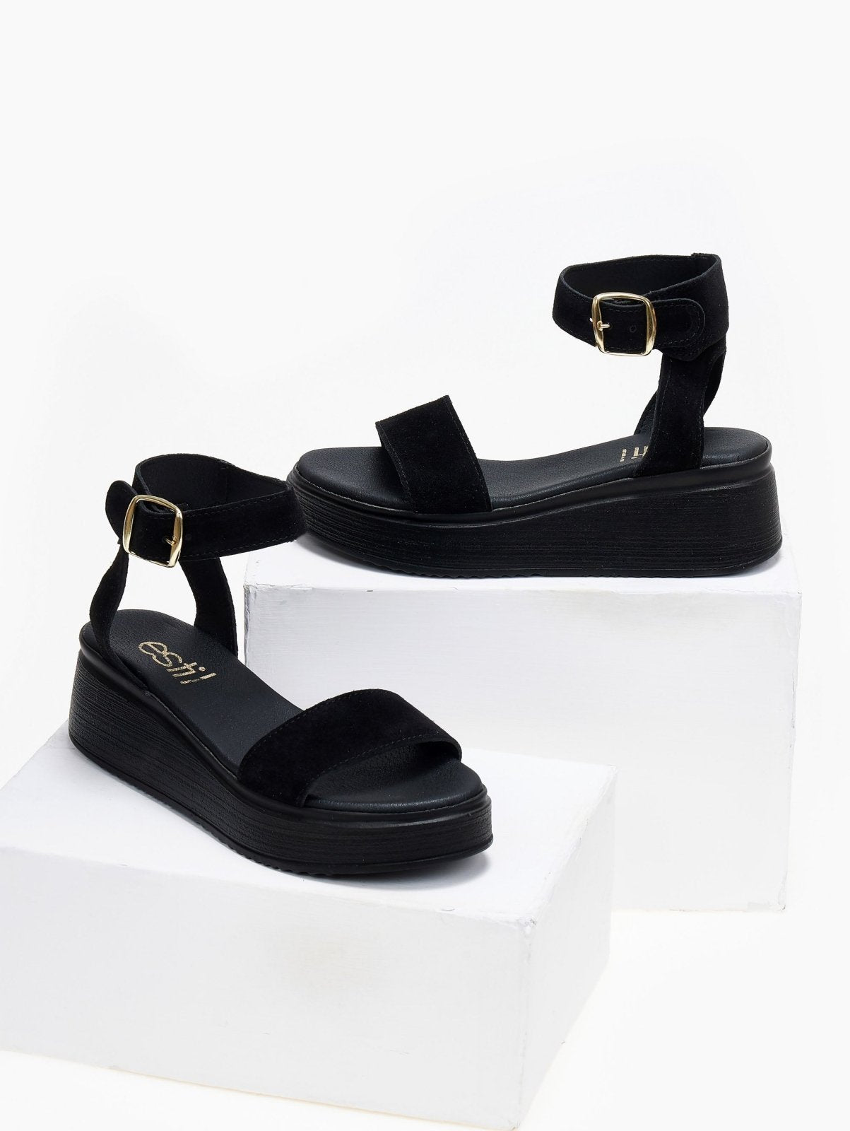 Σανδάλια flatforms από γνήσιο δέρμα καστόρι Estil. Δένουν με μπαρέτα στο ύψος του αστραγάλου. Μαλακός πάτος με ενίσχυση. Ελληνικής κατασκευής.