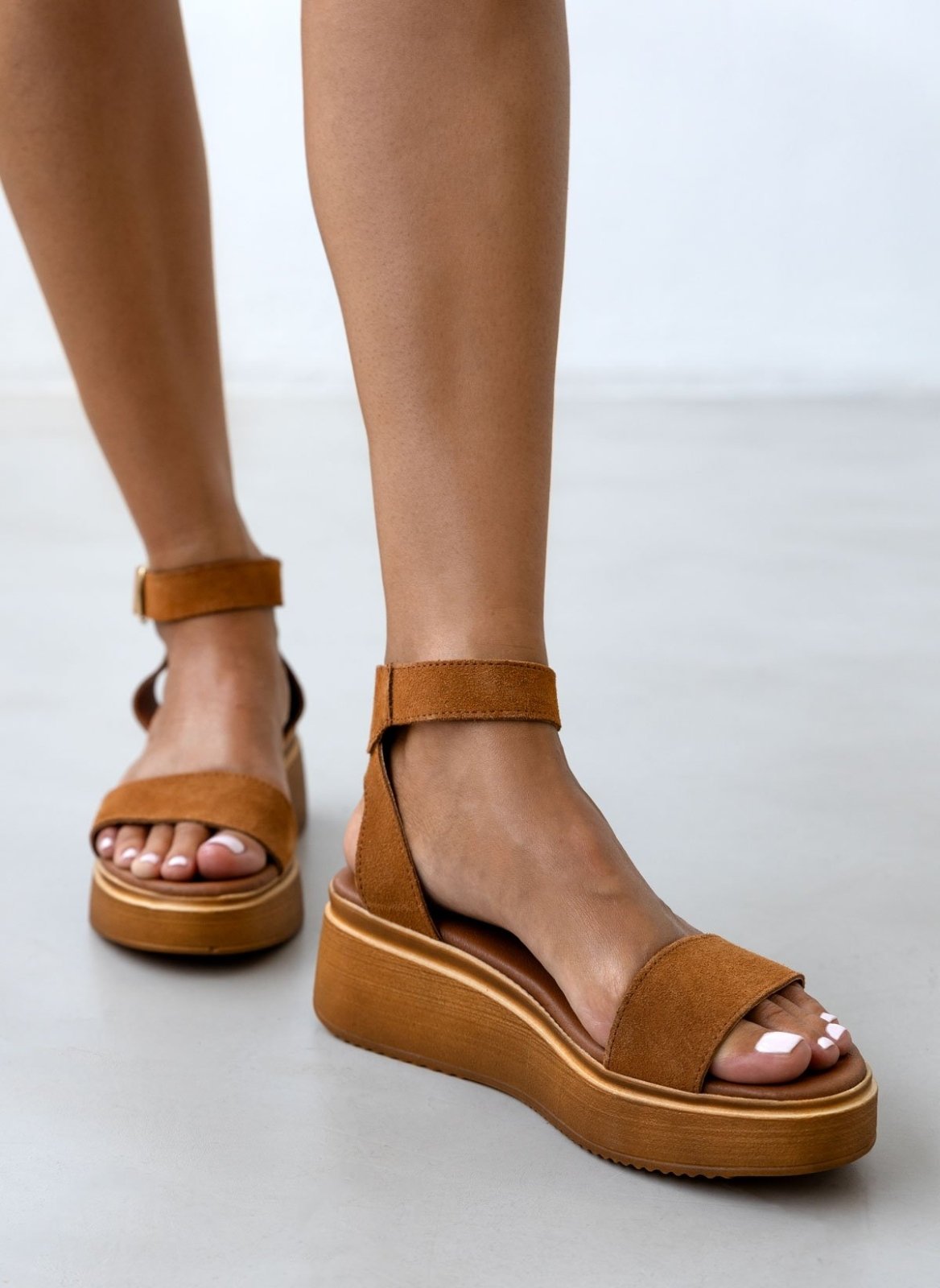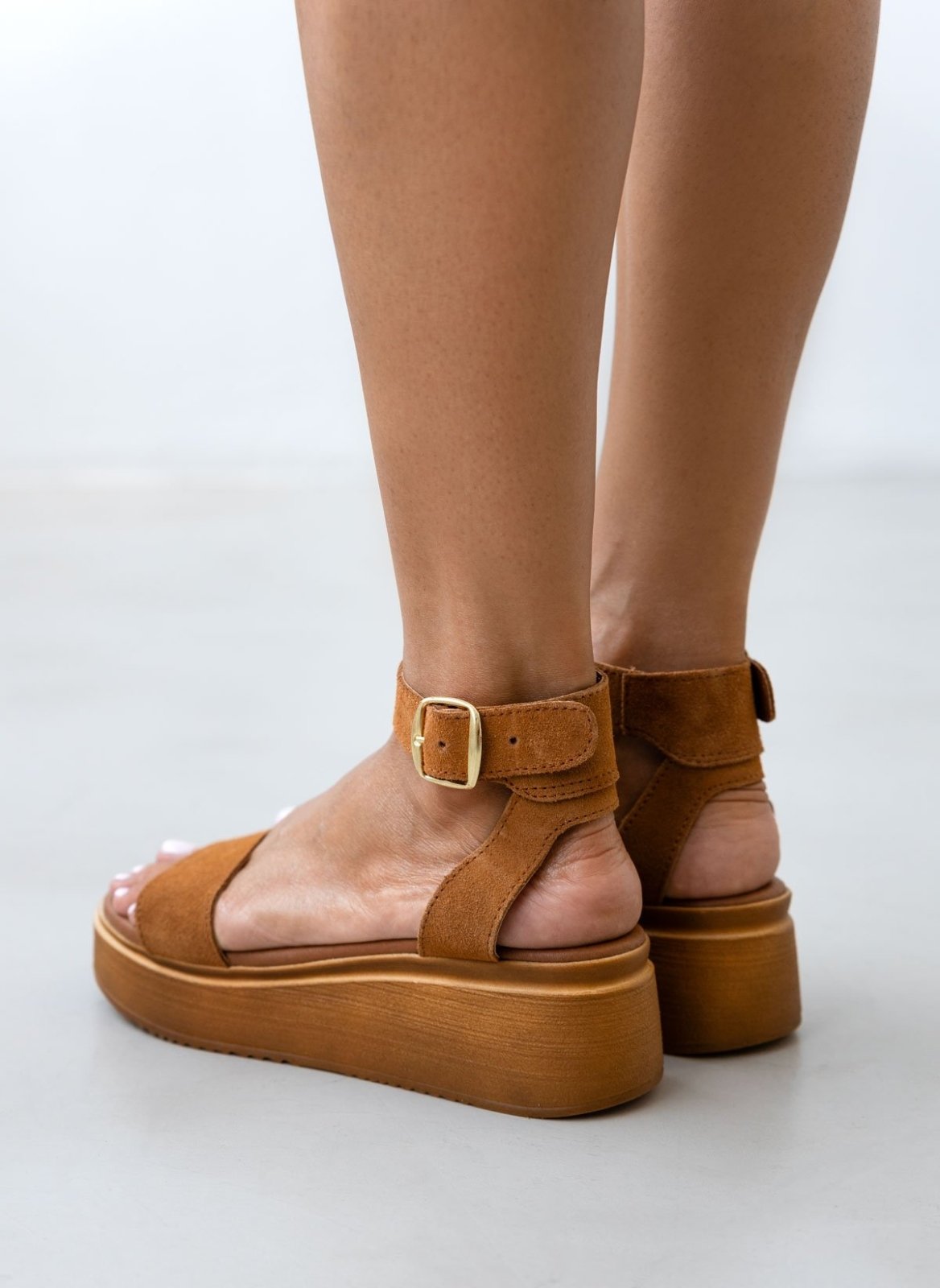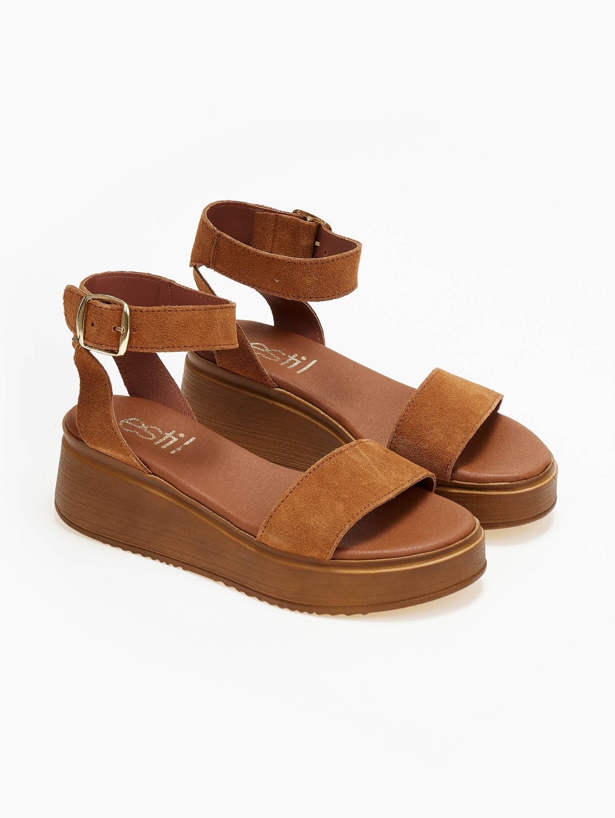 Σανδάλια flatforms από γνήσιο δέρμα καστόρι Estil. Δένουν με μπαρέτα στο ύψος του αστραγάλου. Μαλακός πάτος με ενίσχυση. Ελληνικής κατασκευής.