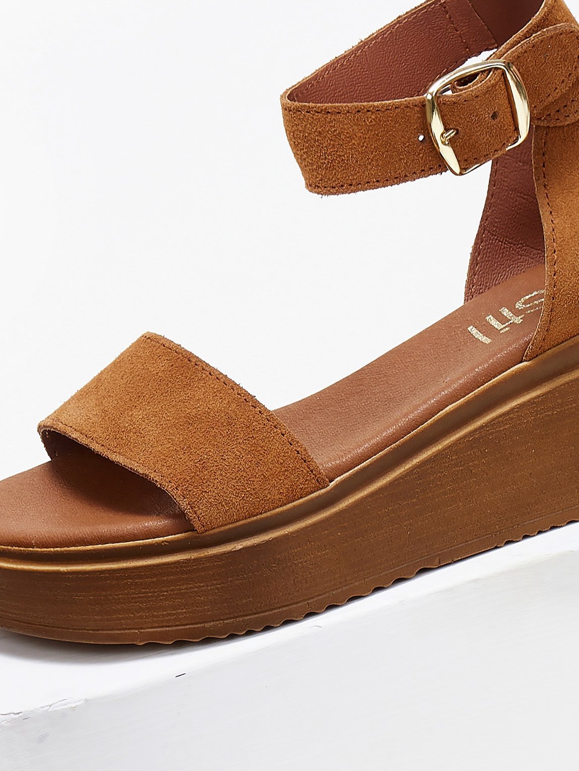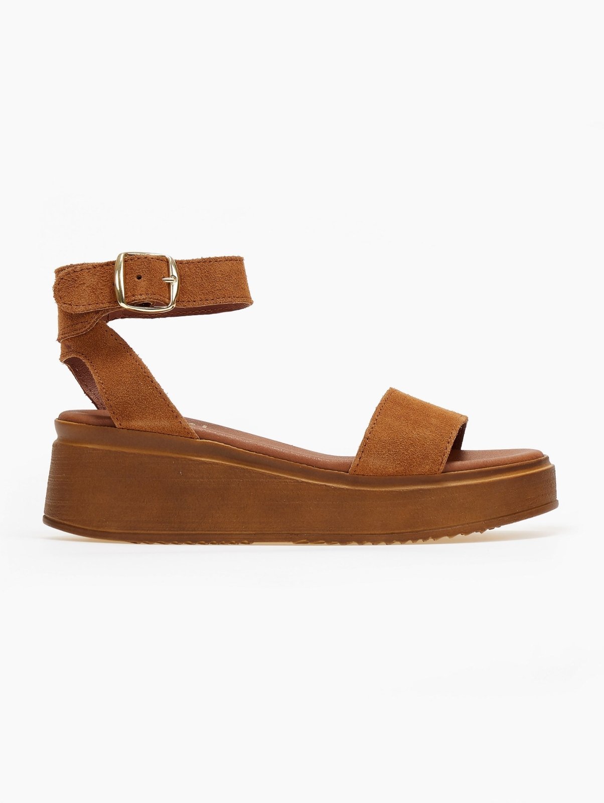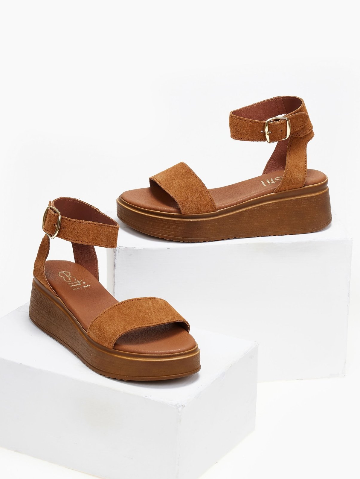 Σανδάλια flatforms από γνήσιο δέρμα καστόρι Estil. Δένουν με μπαρέτα στο ύψος του αστραγάλου. Μαλακός πάτος με ενίσχυση. Ελληνικής κατασκευής.