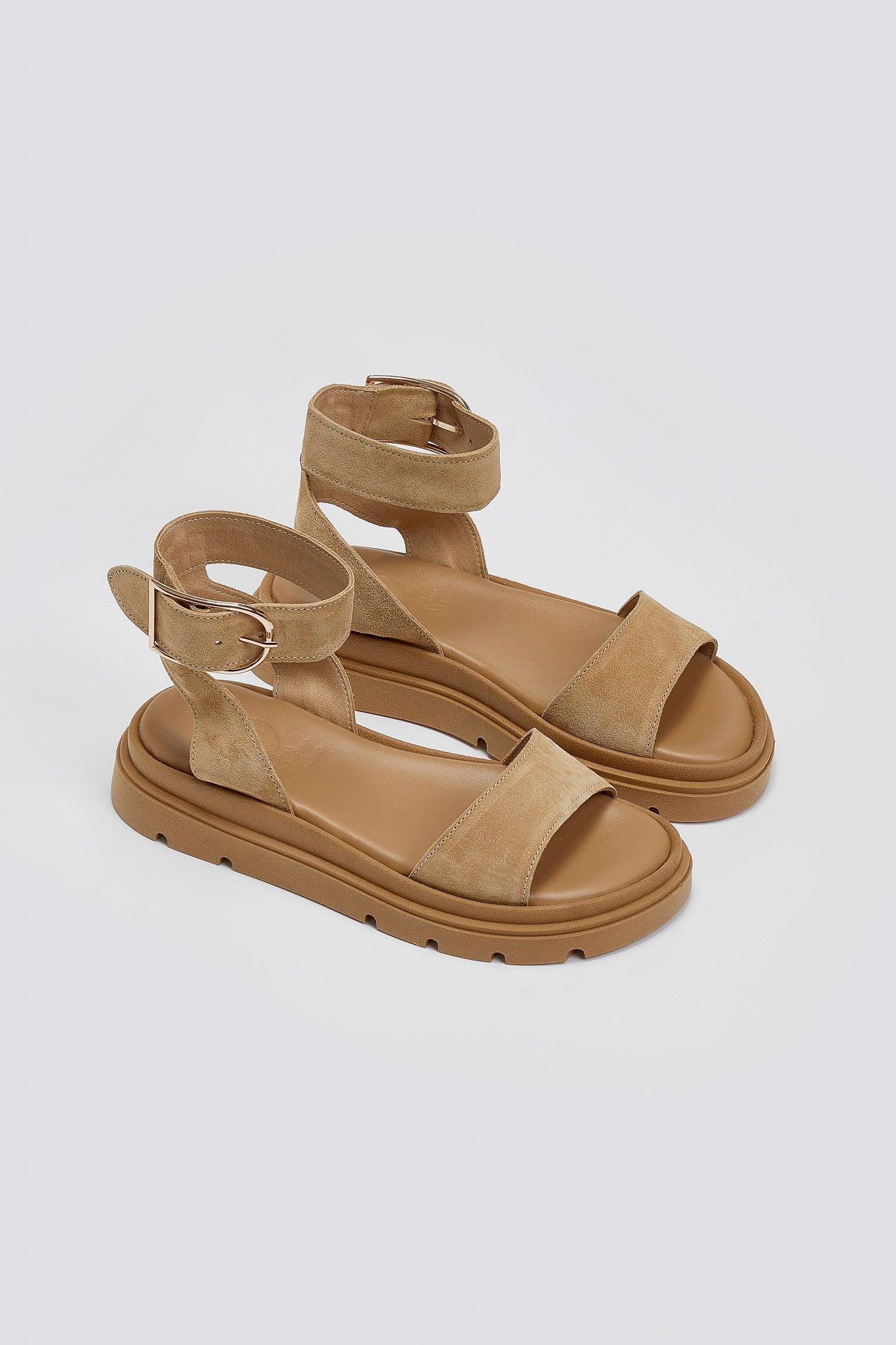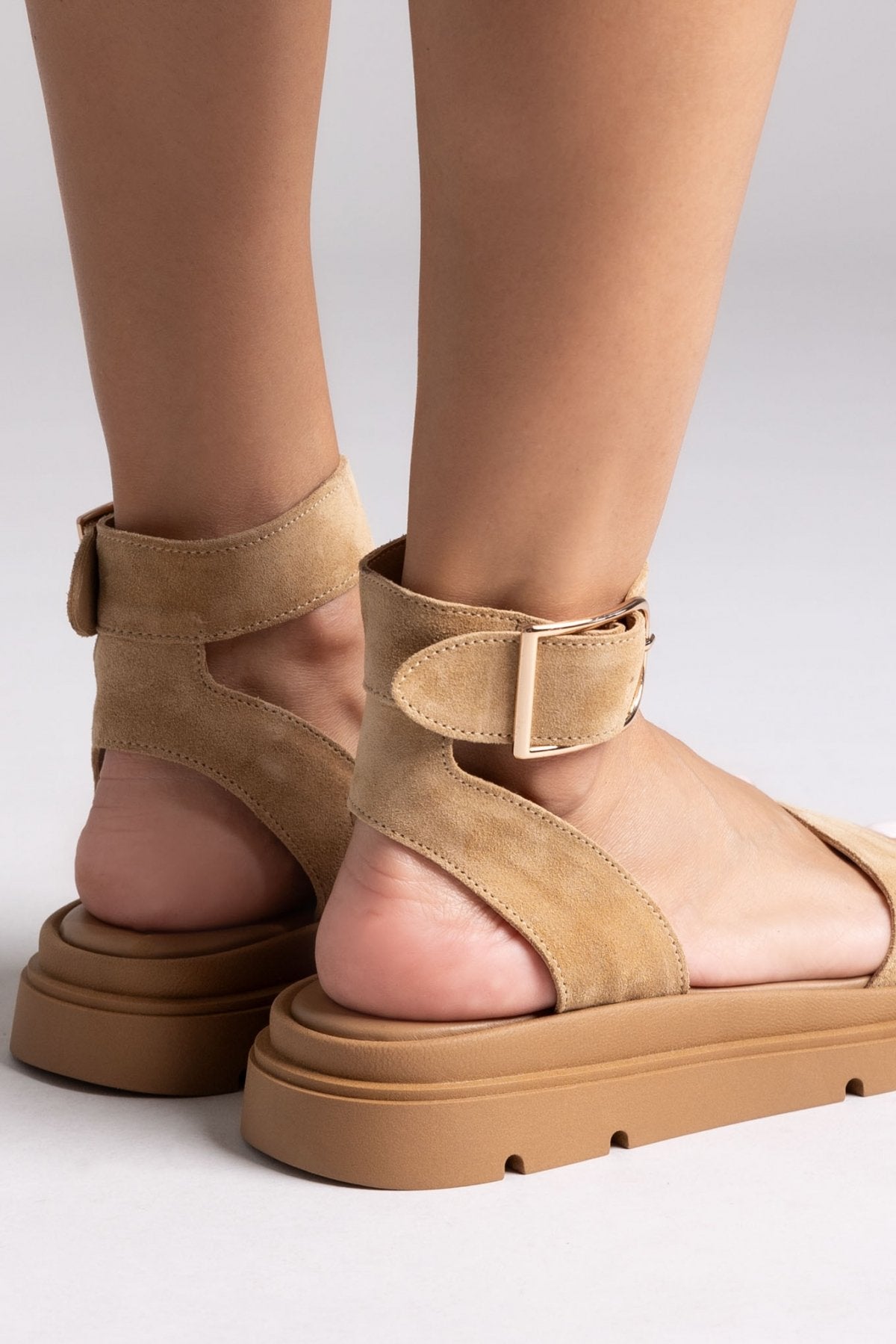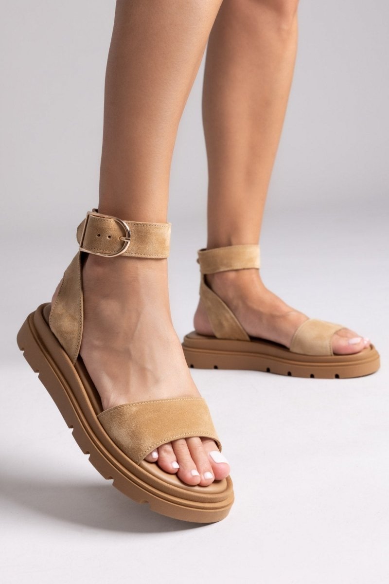 Σανδάλια flatforms από γνήσιο δέρμα καστόρι TFP. Δέσιμο με φαρδιά μπαρέτα με μεγάλο τοκά. Μαλακός πάτος με ενίσχυση.