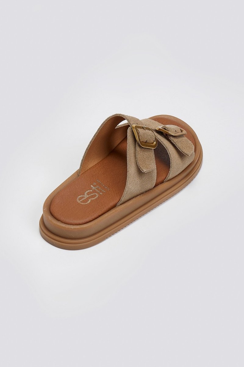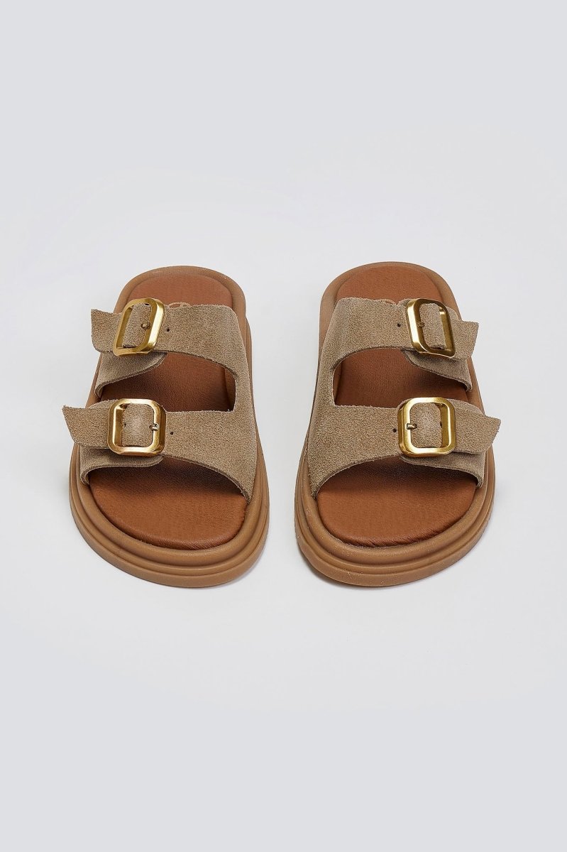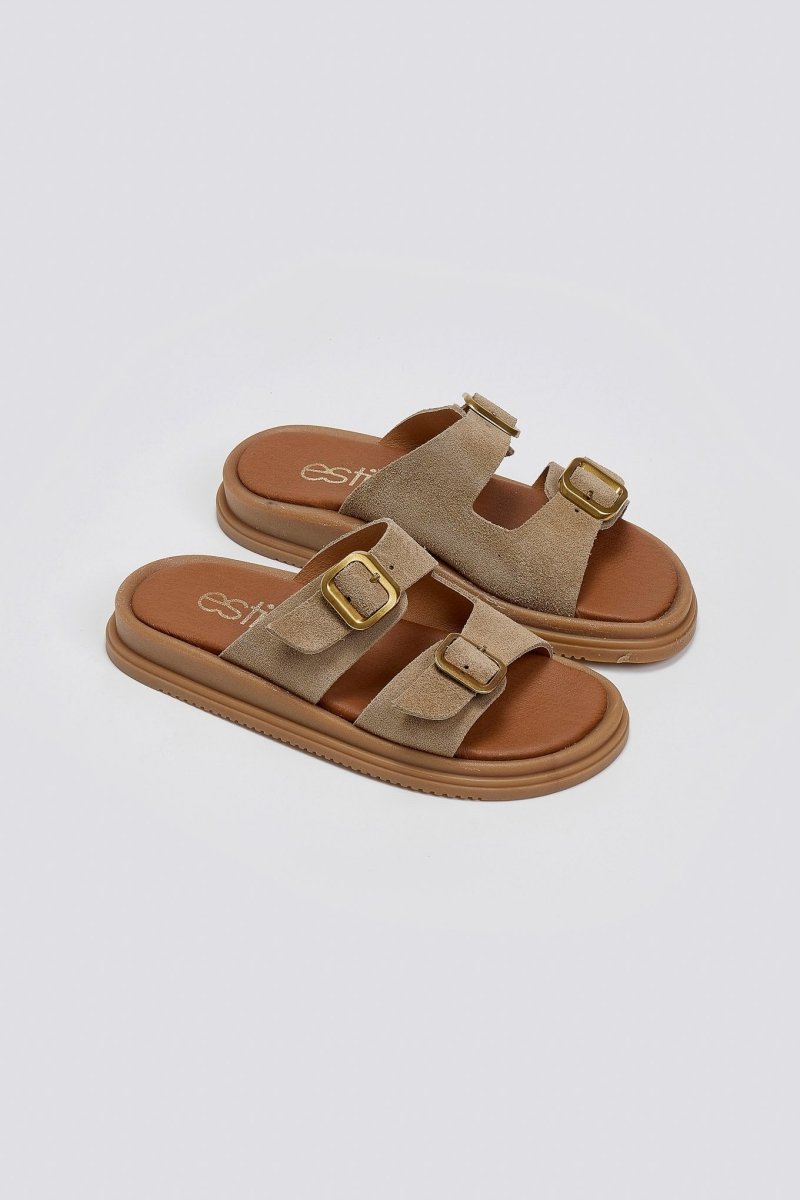 Σανδάλια flatforms από γνήσιο δέρμα καστόρι Estil. Φαρδιές φάσες με μεταλλικούς τοκάδες. Μαλακός πάτος με ενίσχυση. Ελληνικής κατασκευής.