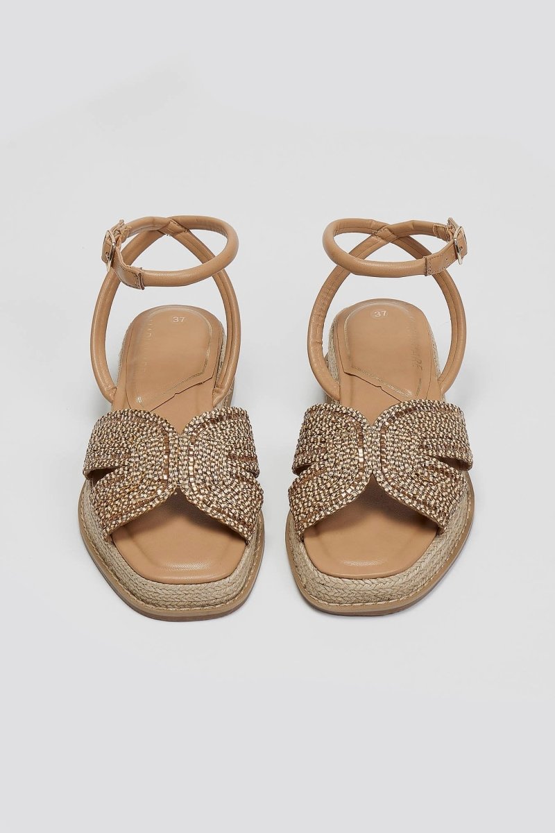 Σανδάλια με φαρδιά φάσα από ψάθα και διακριτικές πέτρες. Δένουν με μπαρέτα στο ύψος του αστραγάλου. Μαλακός πάτος με ενίσχυση. Flatform σόλα ντυμένη με σχοινί.