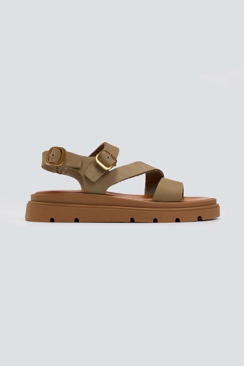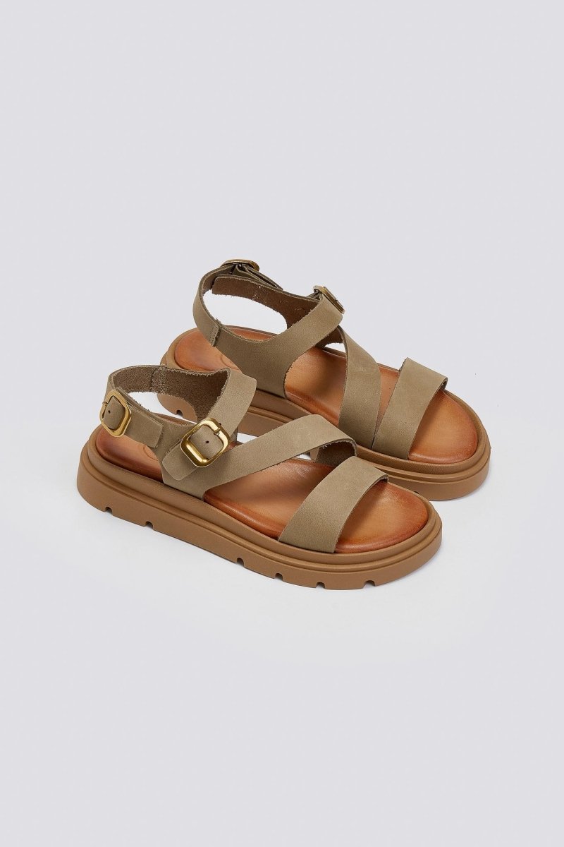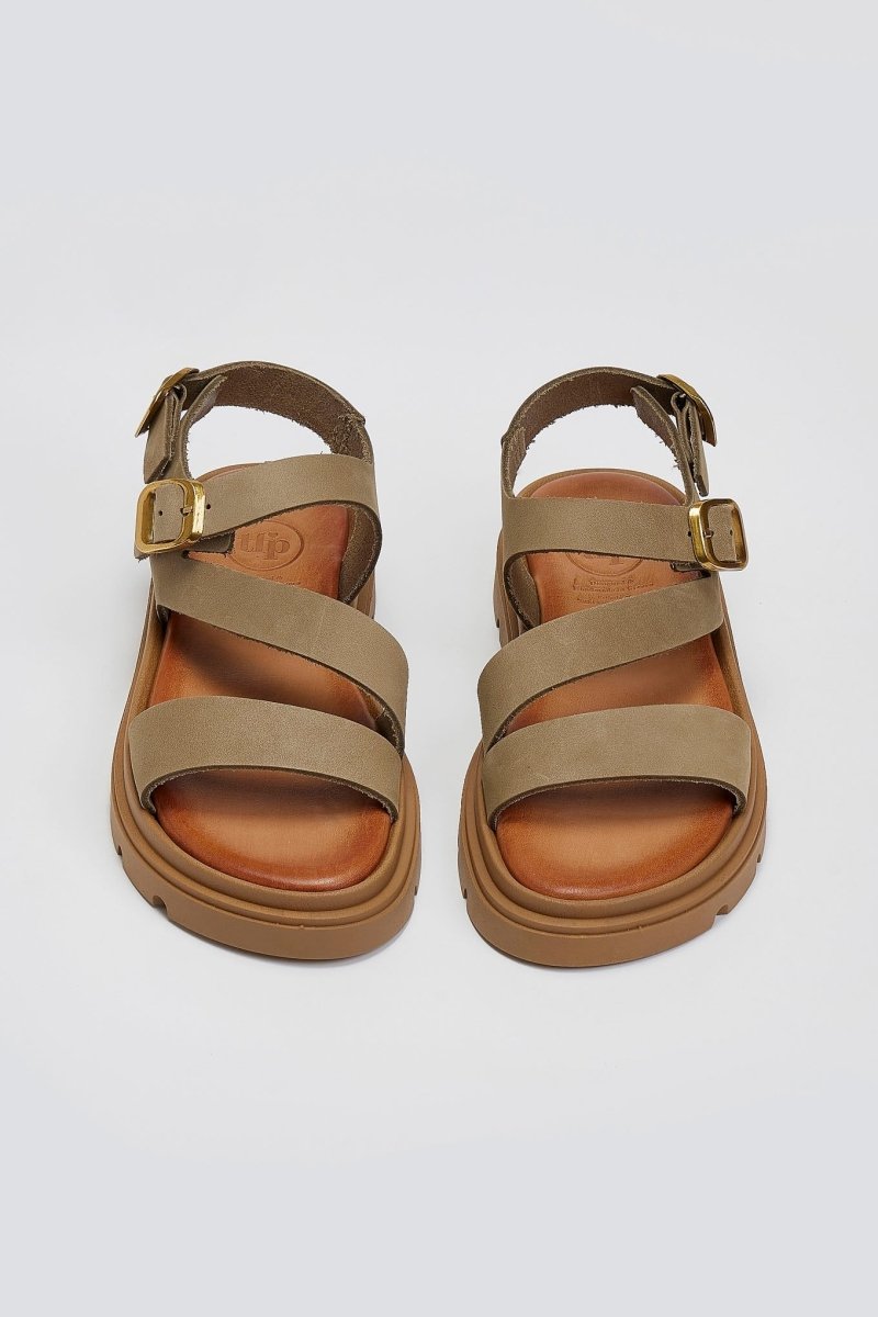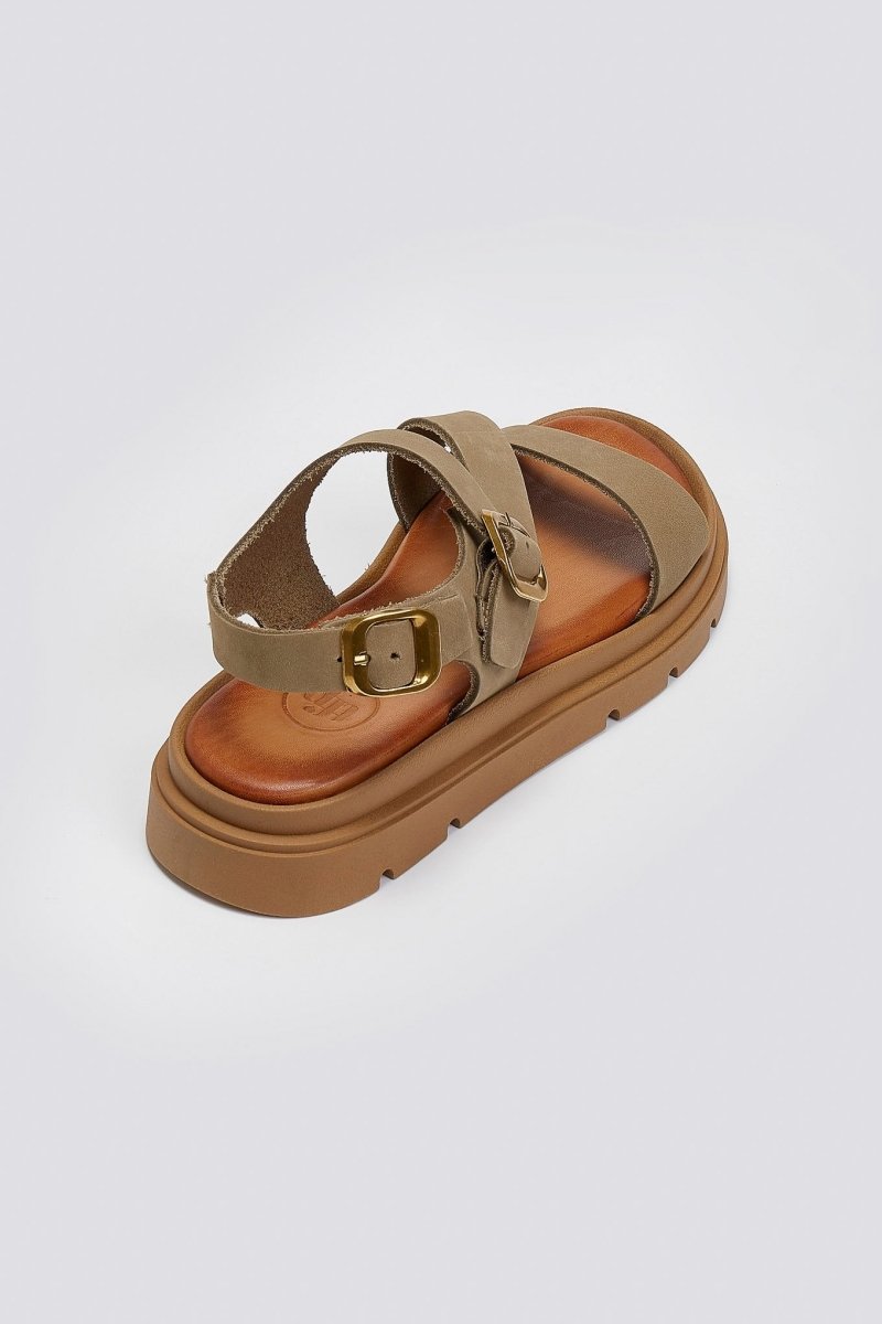 Σανδάλια από γνήσιο δέρμα καστόρι Tfp. Διπλό κούμπωμα με τοκάδες στο ύψος του αστραγάλου. Δερμάτινος μαλακός πάτος με ενίσχυση.