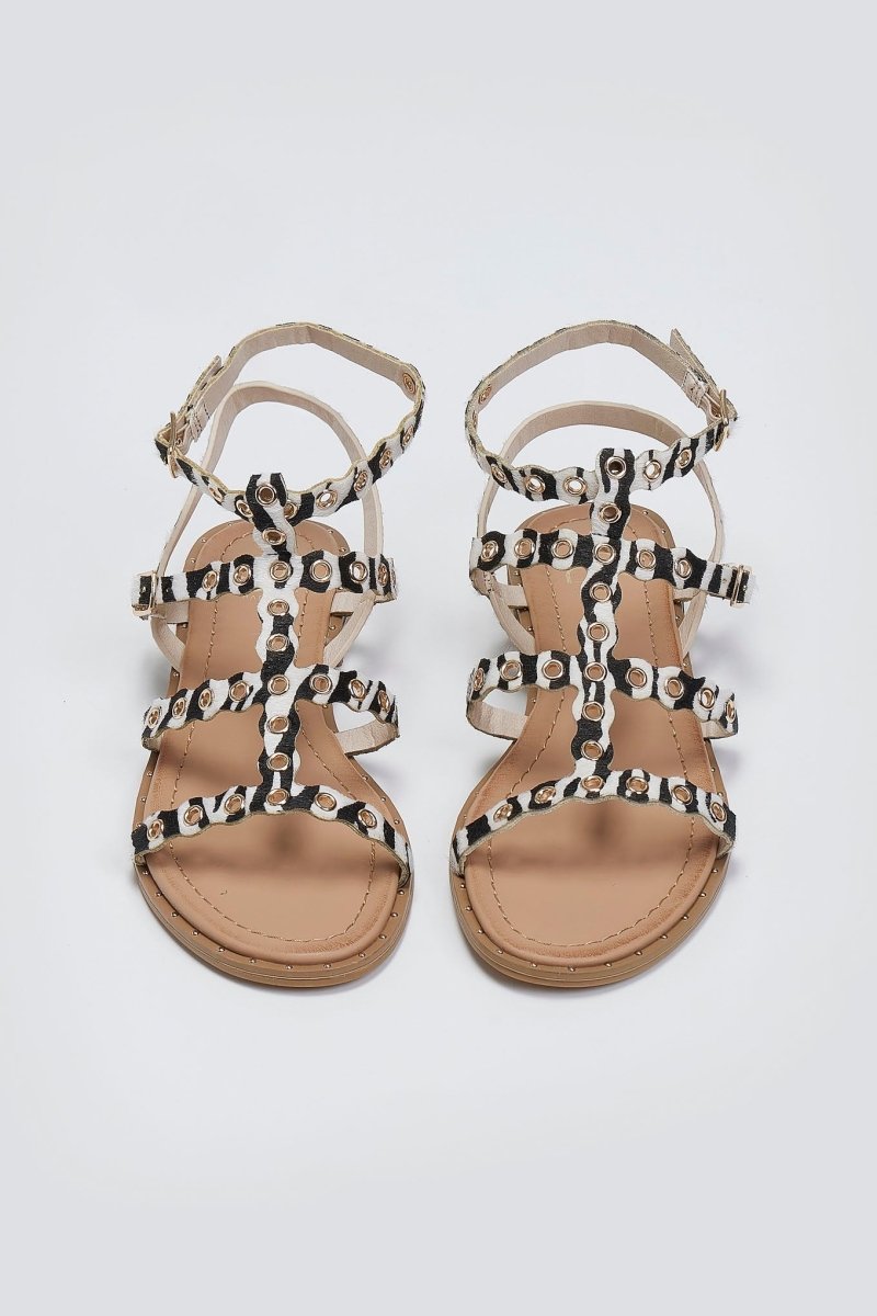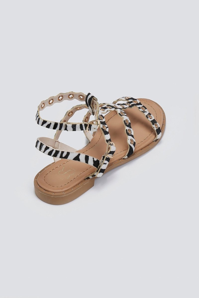 Σανδάλια με ponyskin και animal print Erynn. Λεπτά λουράκια με μεταλλικά τρουκς. Δένουν με μπαρέτα στο ύψος του αστραγάλου. Λεπτομέρεια μεταλλικά τρουκς περιμετρικά της σόλας.