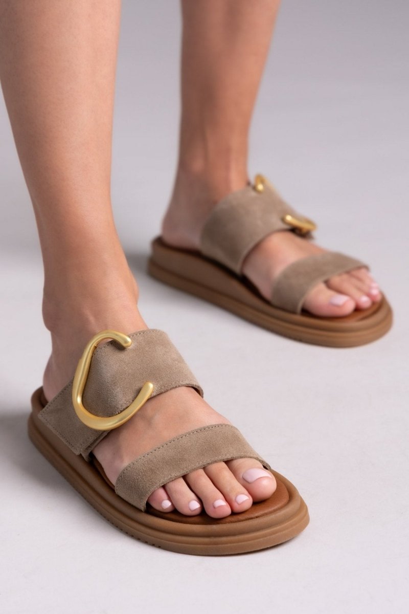 Σανδάλια από γνήσιο δέρμα καστόρι Estil. Φαρδιές φάσες με έντονο μεταλλικό στοιχείο. Μαλακός πάτος με ενίσχυση. Comfort εύκαμπτη σόλα. Ελληνικής κατασκευής.