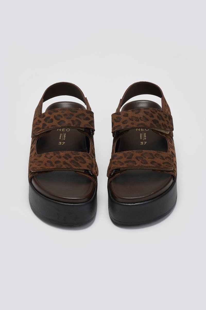Σανδάλια από γνήσιο δέρμα καστόρι με animal print ATENEO. Φάσες με velcro αυτοκόλλητα. Κλείνουν στο πλάι. Ελληνικής κατασκευής.
