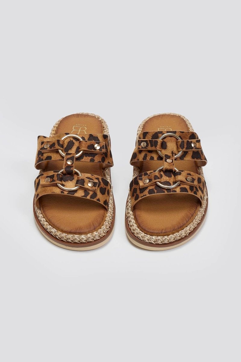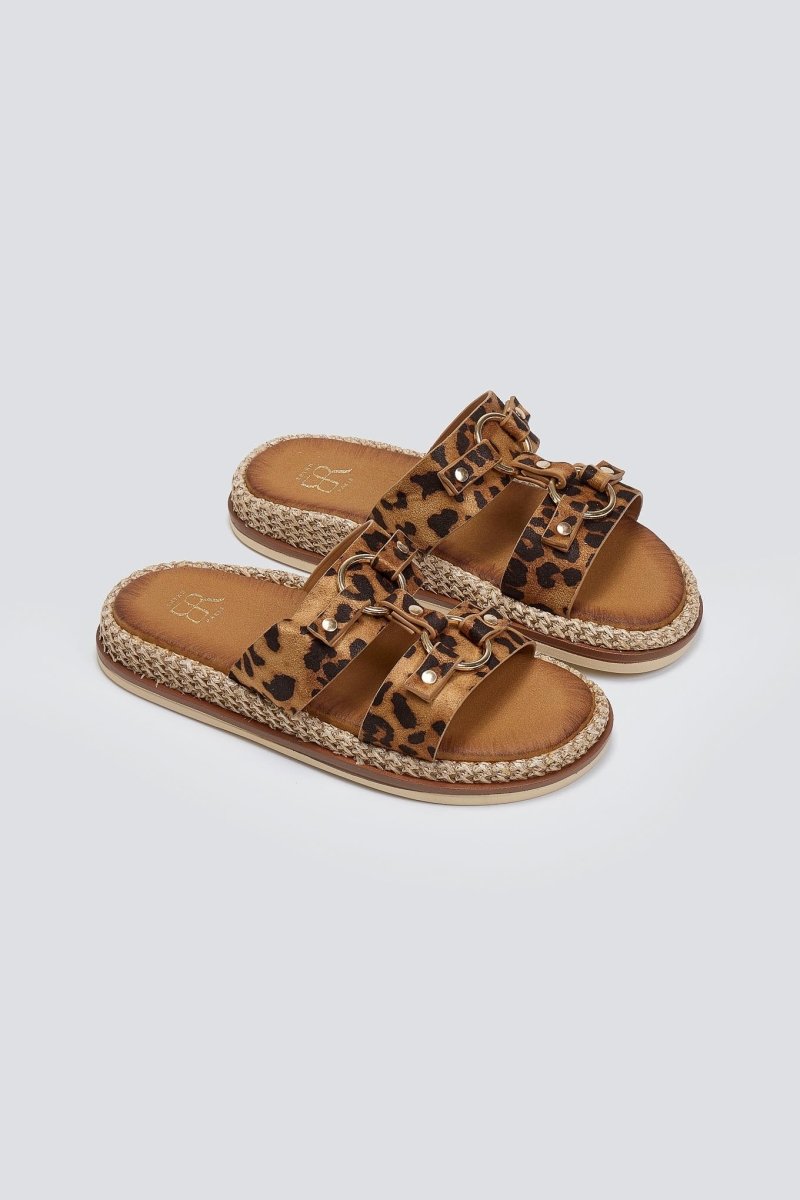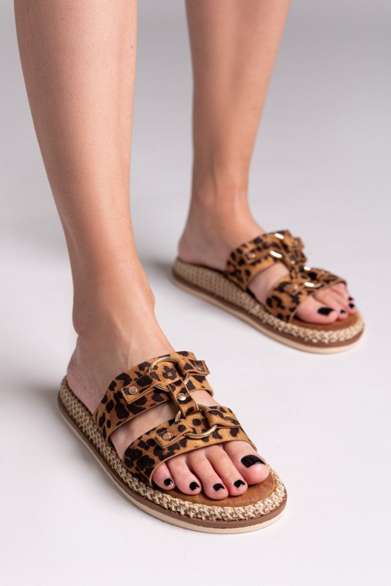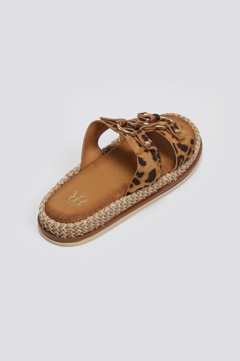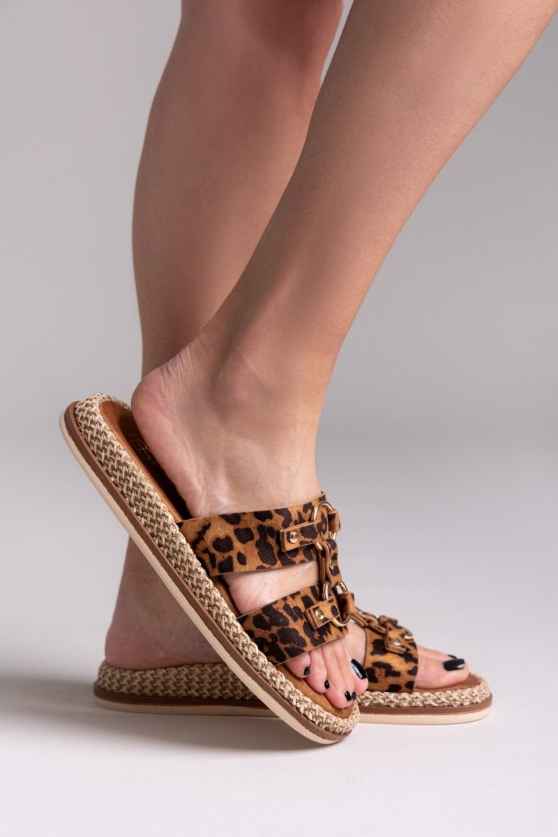 Σανδάλια suede με print leopard ERYNN. Σχέδιο με μεταλλικούς κρίκους. Χαμηλή σόλα ντυμένη με ψάθα.