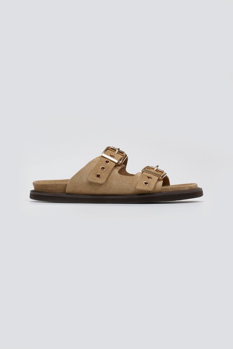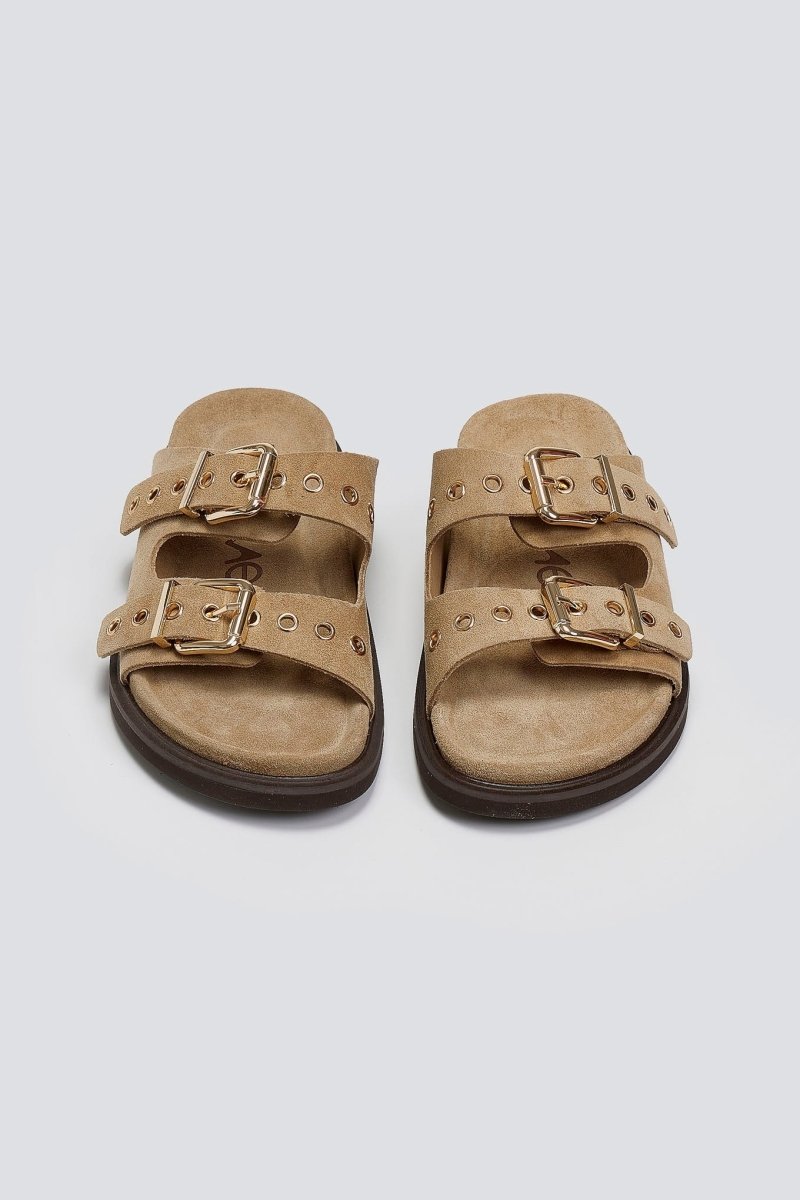 Σανδάλια από γνήσιο δέρμα καστόρι Take me. Φαρδιές φάσες με μεταλλικά τρουκς και τοκάδες. Καστόρινος πάτος με ανατομικό σχήμα. Made in Spain.