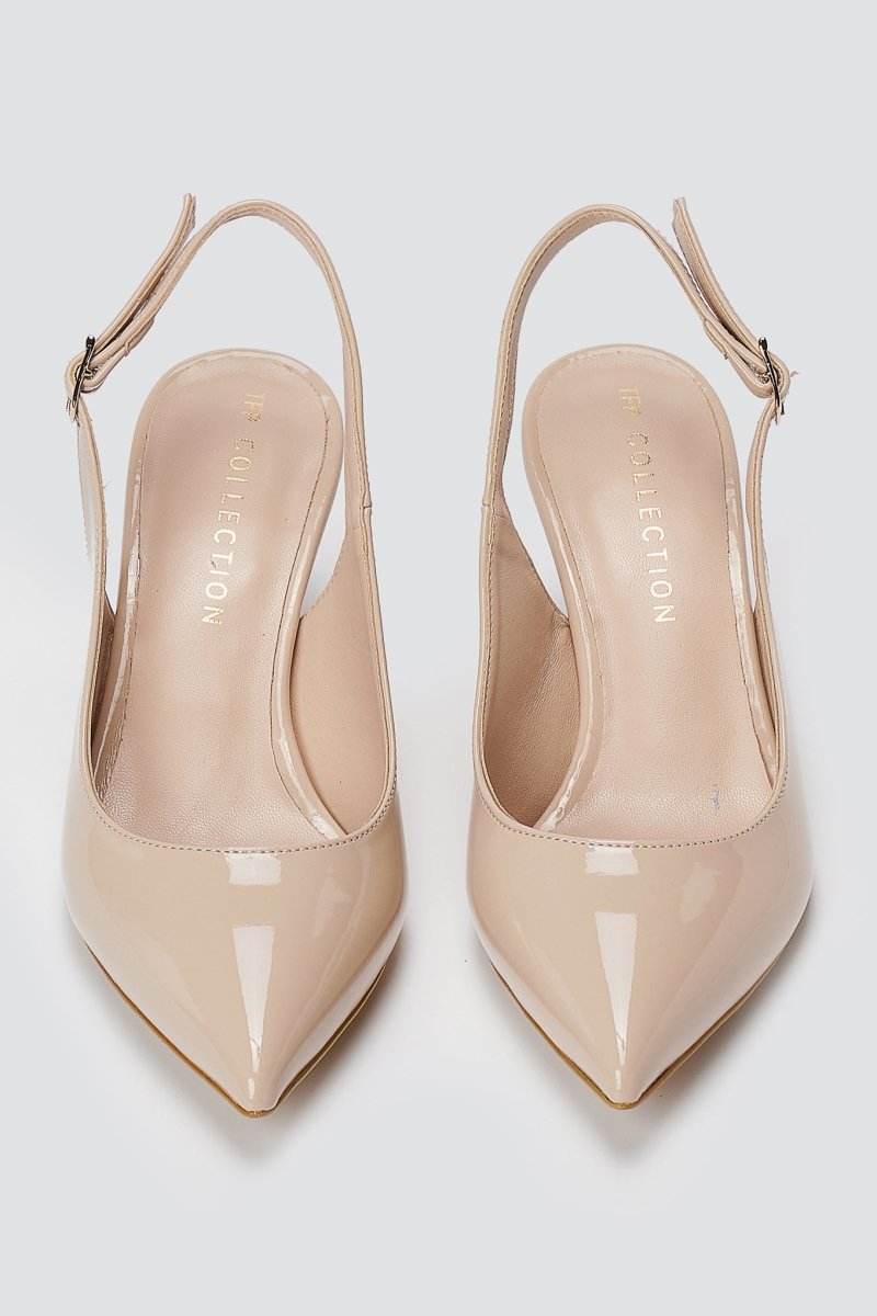 Μυτερές slingback kitten heel γόβες σε γυαλιστερό λουστρίνι, διακοσμημένες με πλαϊνή αγκράφα για σταθερή εφαρμογή. Εκλεπτυσμένη σιλουέτα με κομψή άνεση, κατασκευασμένη για σύγχρονες γυναίκες.
