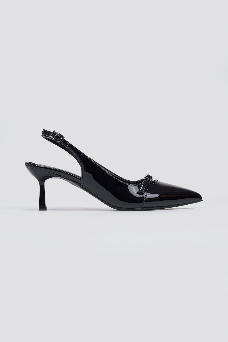 Slingback λουστρίνι γόβες με μυτερή μύτη και χαμηλό τακούνι. Πλαϊνό λουράκι, μαλακός πάτος, σταθερή εφαρμογή. Κατασκευασμένες στην Ελλάδα, κομψές και ευέλικτες για κάθε περίσταση.