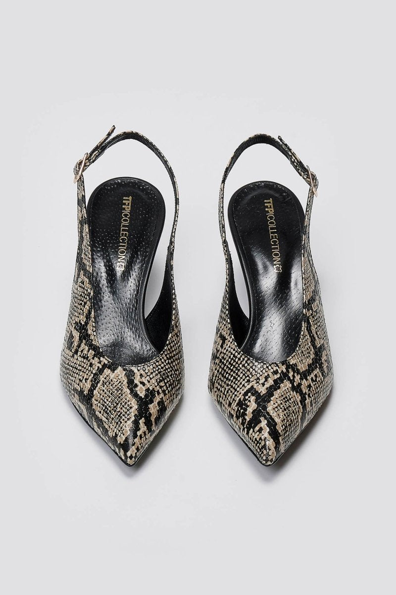 Μυτερές γόβες slingback από την TFP με snake-print επάνω μέρος και πλαϊνό λουράκι με αγκράφα. Κομψή σιλουέτα, μαλακή αντικραδασμική σόλα—κομψά τακούνια για το γραφείο και τη βραδινή έξοδο.
