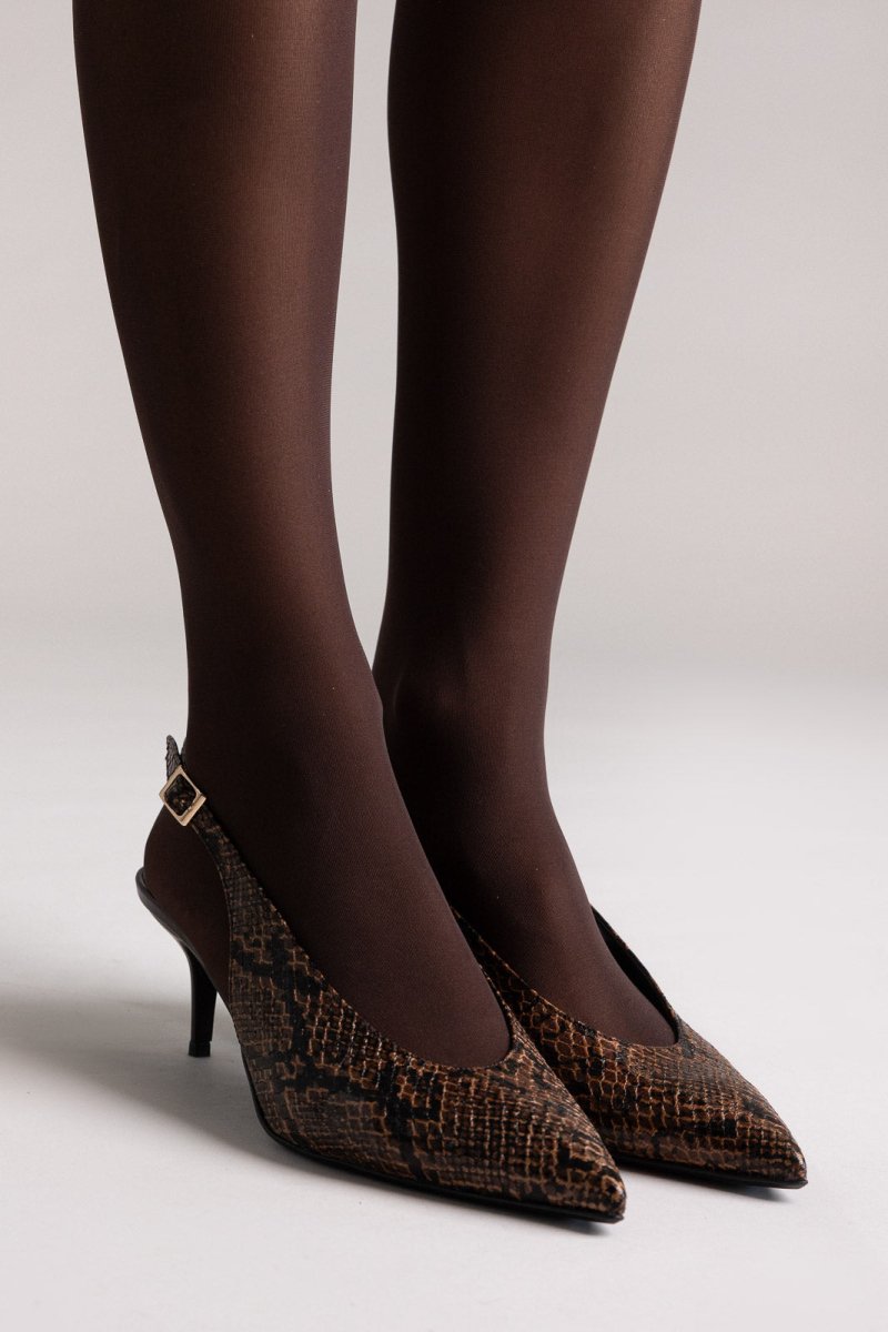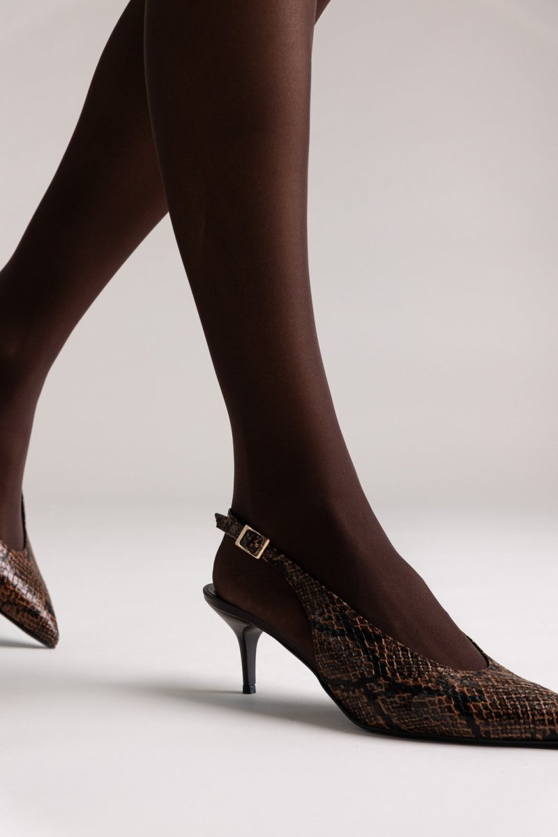 Μυτερές γόβες slingback από την TFP με snake-print επάνω μέρος και πλαϊνό λουράκι με αγκράφα. Κομψή σιλουέτα, μαλακή αντικραδασμική σόλα—κομψά τακούνια για το γραφείο και τη βραδινή έξοδο.