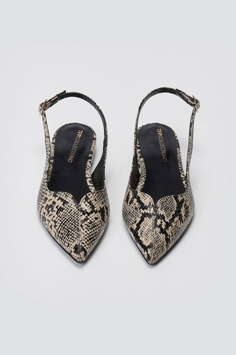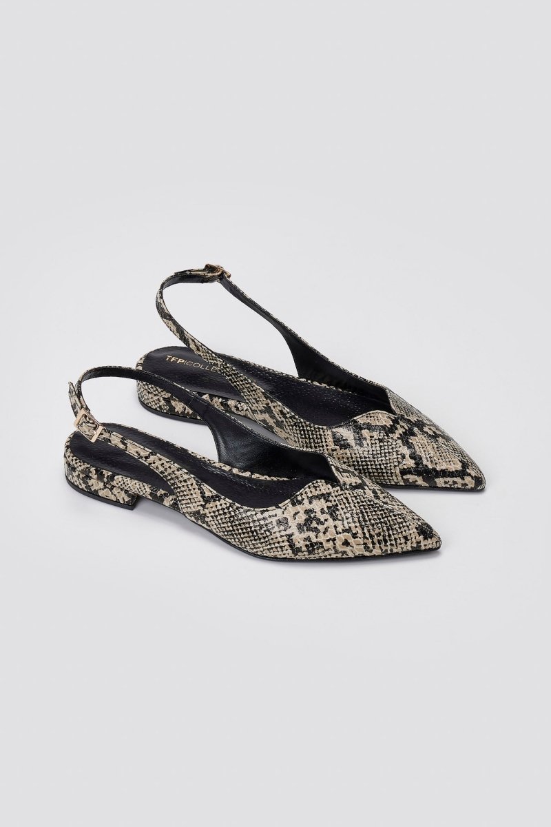 Μπαλαρίνες slingback από την TFP με μυτερή μύτη και ανοιχτή φτέρνα. Λουράκι πίσω, μαλακός πάτος, snake λουστρίνι—κομψές μπαλαρίνες για καθημερινή χρήση.