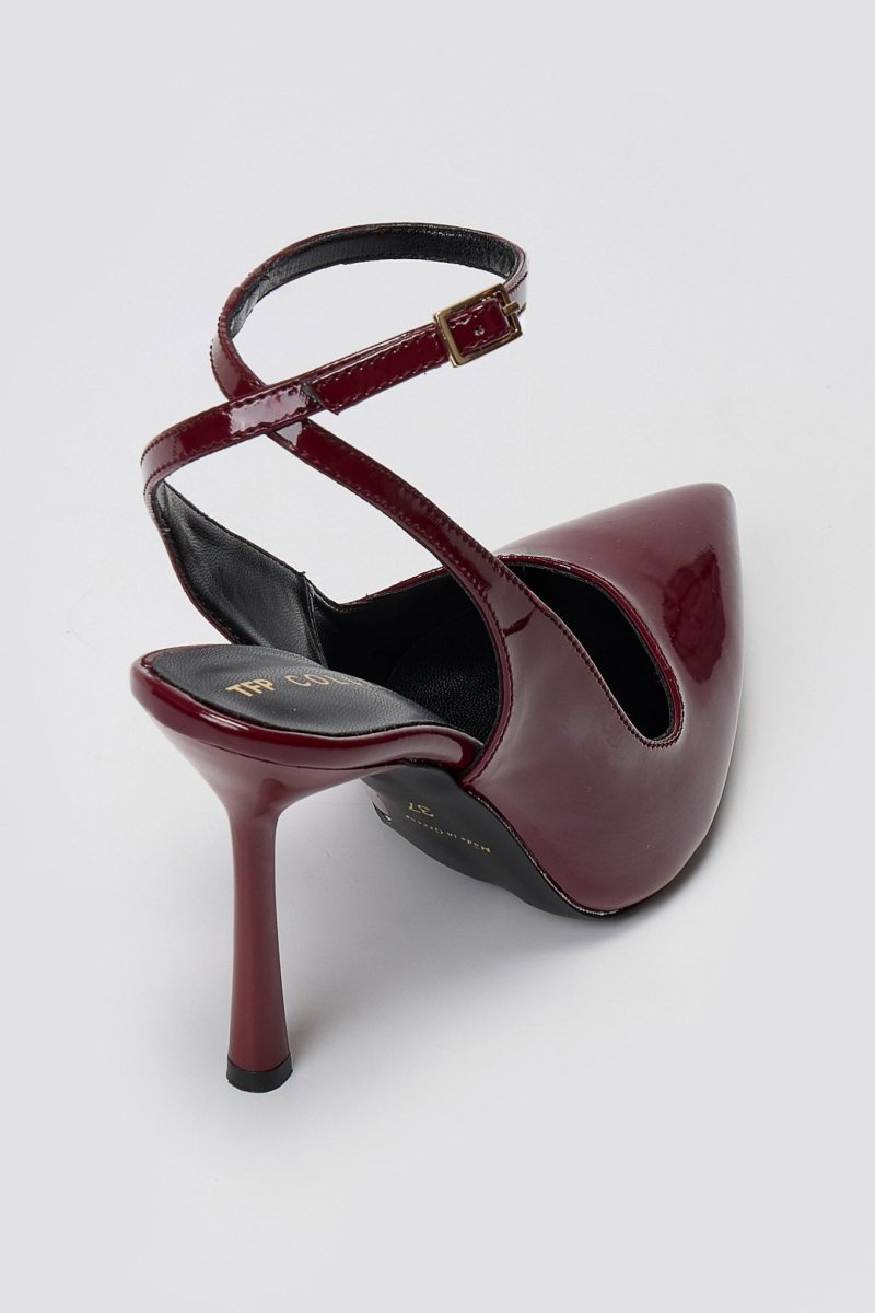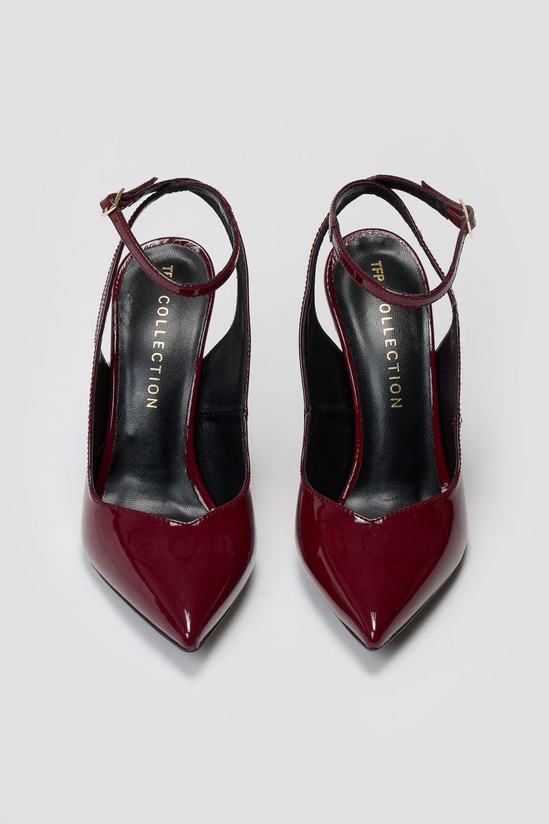 Λουστρίνι μυτερές γόβες με ανοιχτή φτέρνα slingback, V-cut ντεκολτέ και σταθερό λουράκι στον αστράγαλο σε ψηλό τακούνι στιλέτο. Κομψό στυλ και ισορροπημένη άνεση για σύγχρονες γυναίκες.