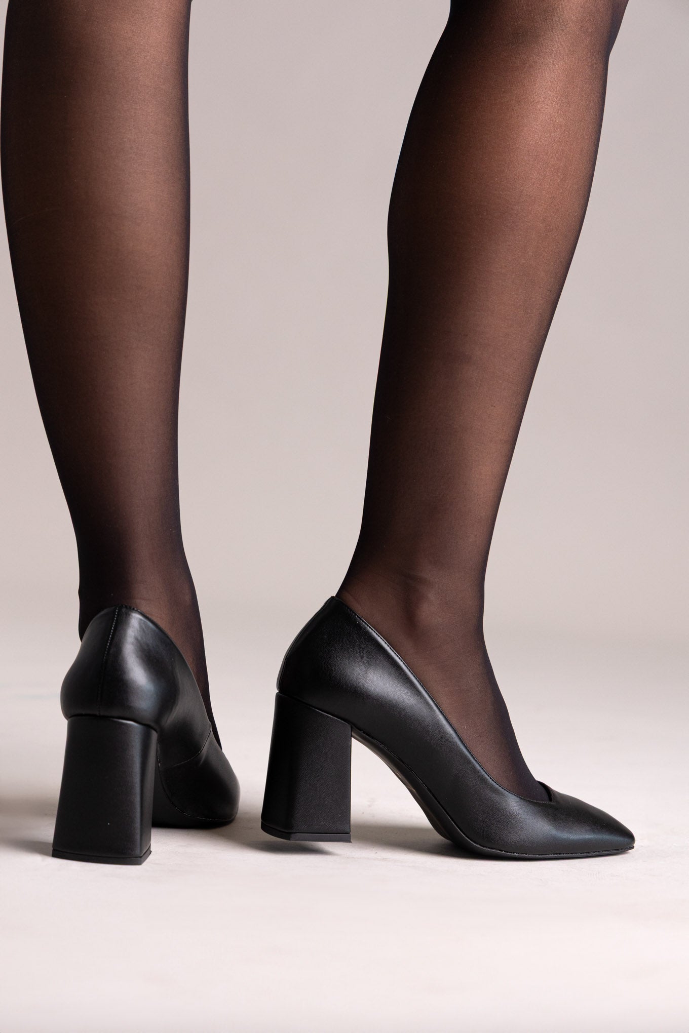 Γόβες με ψηλό τετράγωνο τακούνι και μοντέρνα τετράγωνη μύτη. Καθαρές γραμμές και ισορροπημένη ανύψωση για κομψό στυλ και αυτοπεποίθηση από το πρωί ως το βράδυ.