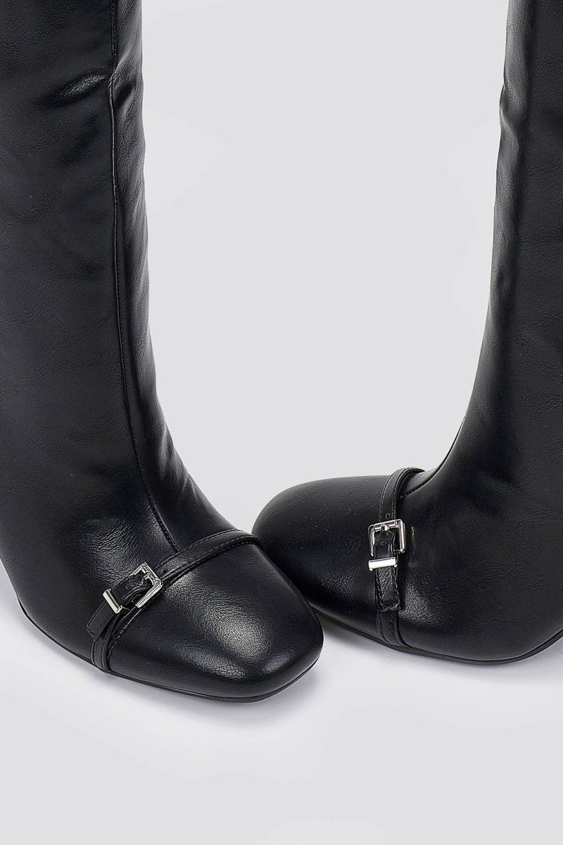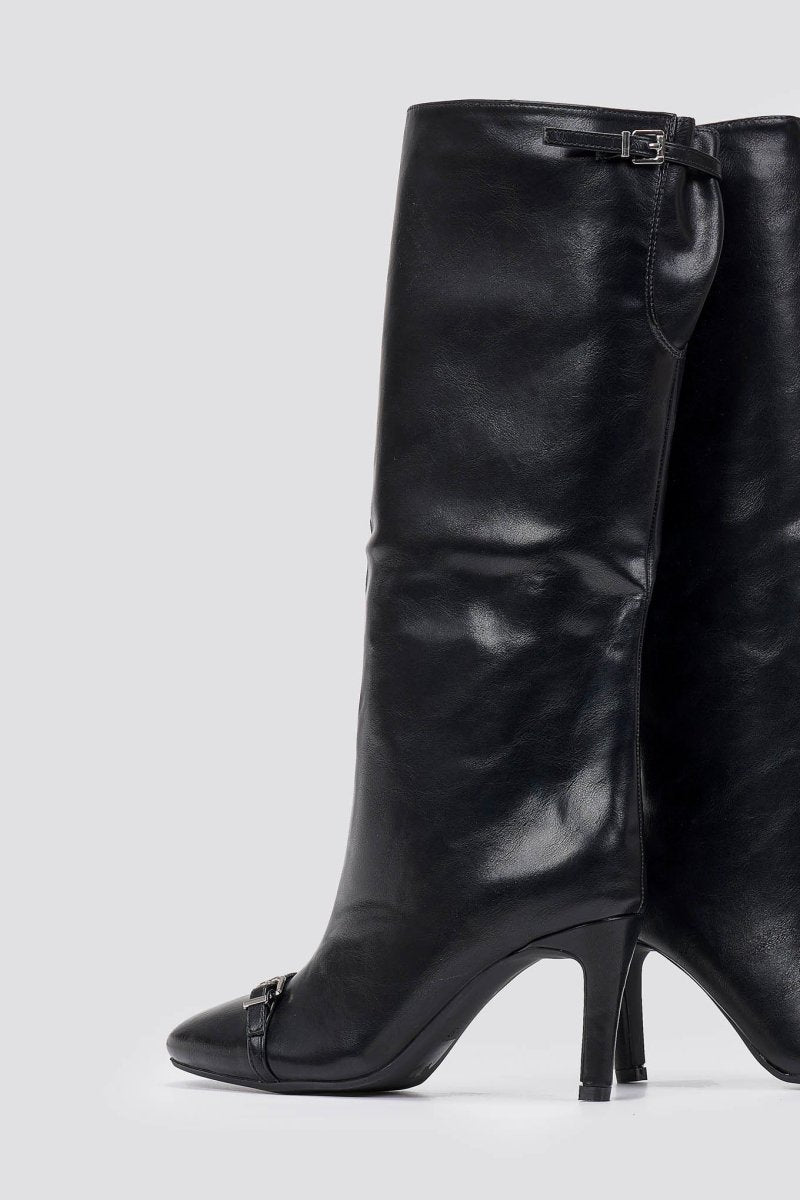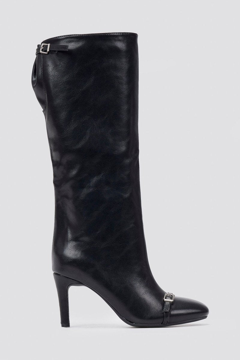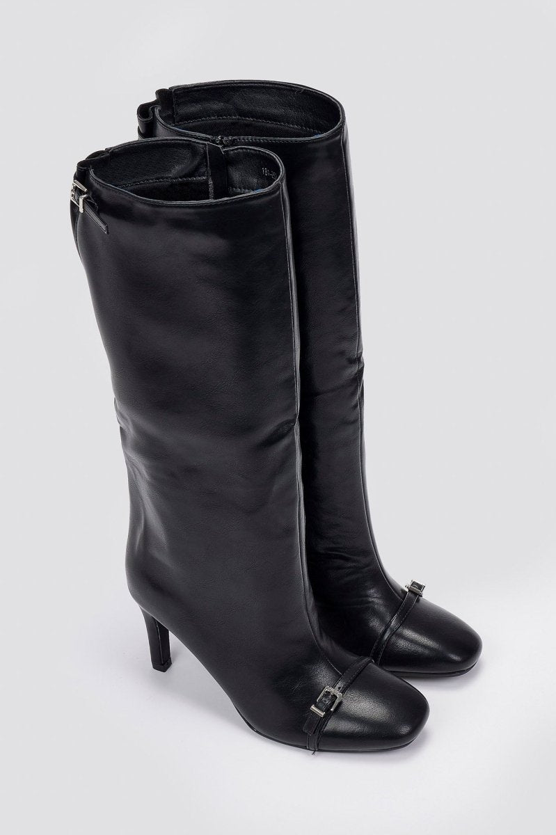 Κομψές μπότες στιλέτο με λεπτή ζώνη και στρογγυλή μύτη. Πλαϊνό φερμουάρ και διακριτική πιέτα στη γάμπα για ευέλικτη εφαρμογή—αναβαθμισμένο, εκλεπτυσμένο στυλ για κάθε περίσταση.
