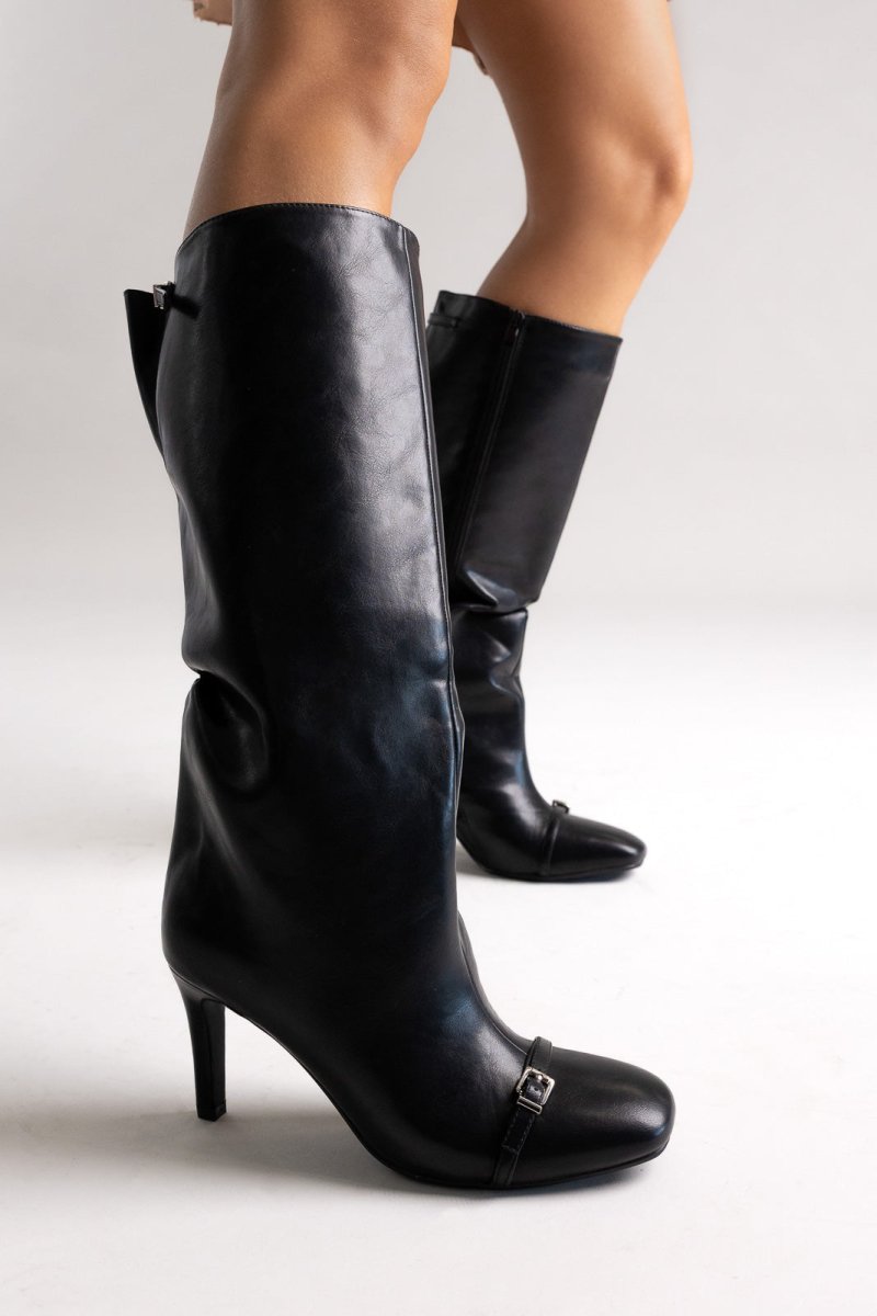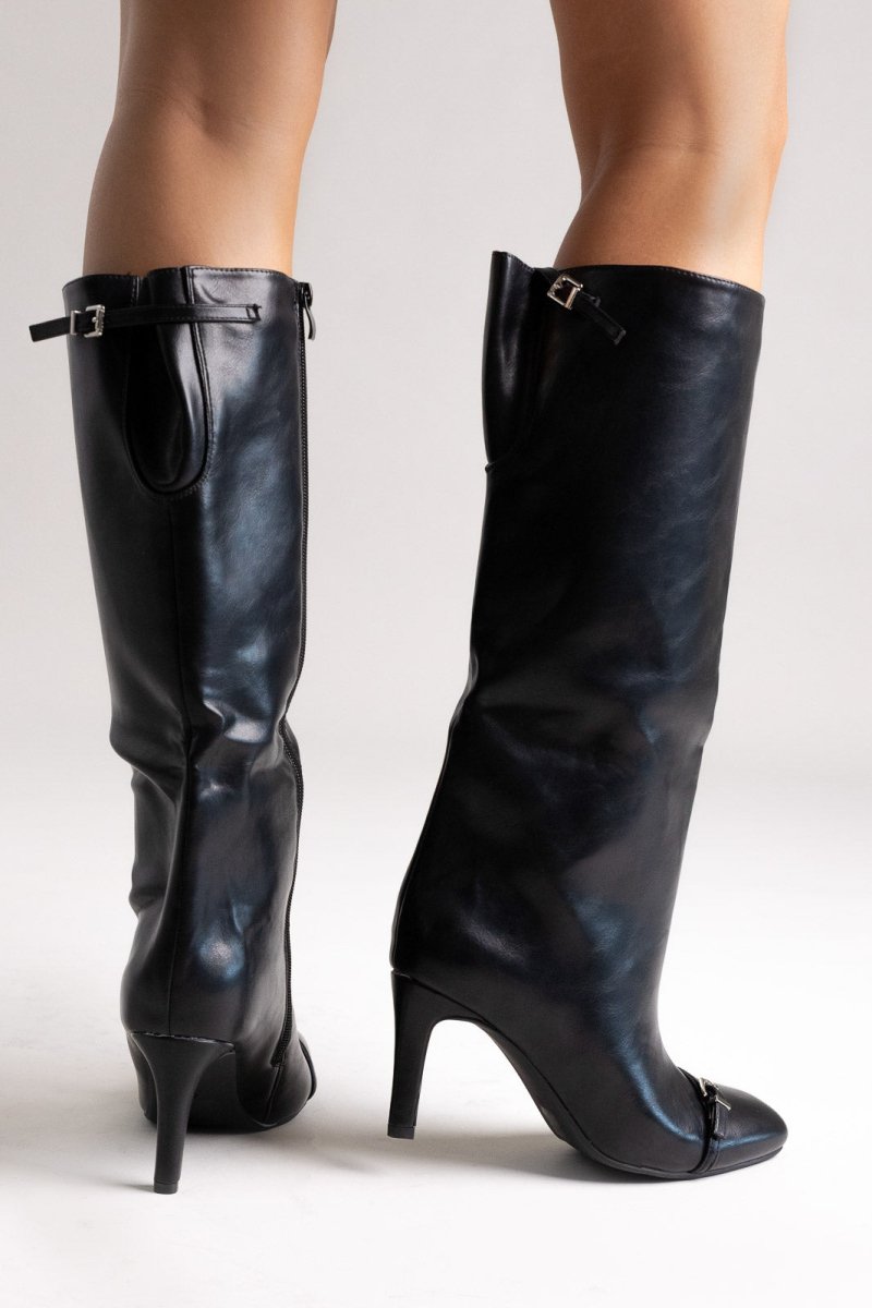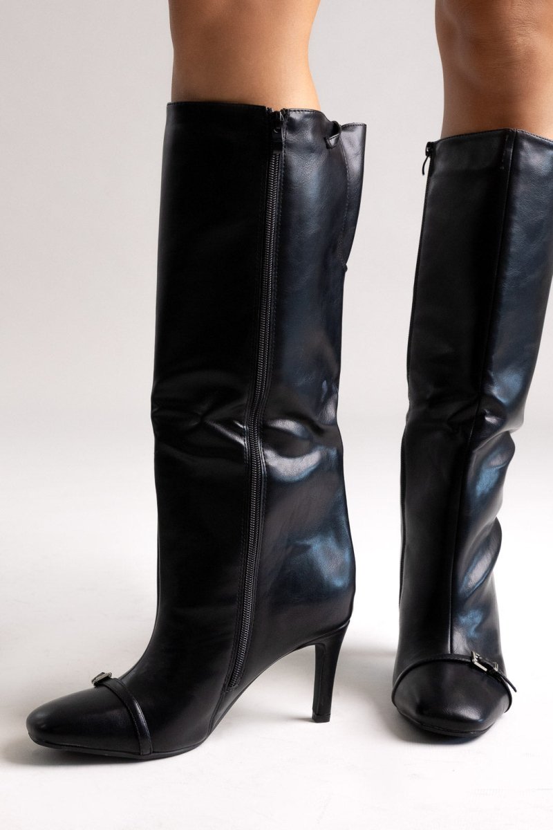 Κομψές μπότες στιλέτο με λεπτή ζώνη και στρογγυλή μύτη. Πλαϊνό φερμουάρ και διακριτική πιέτα στη γάμπα για ευέλικτη εφαρμογή—αναβαθμισμένο, εκλεπτυσμένο στυλ για κάθε περίσταση.