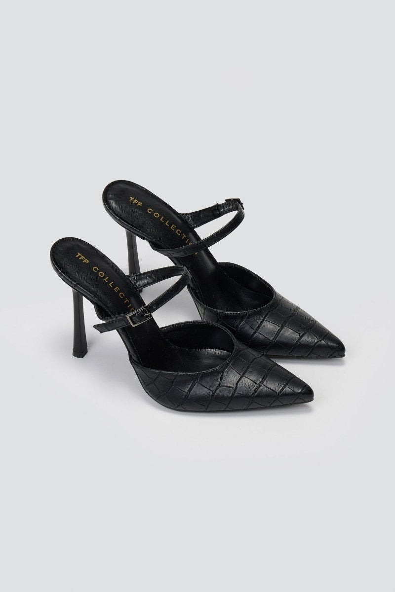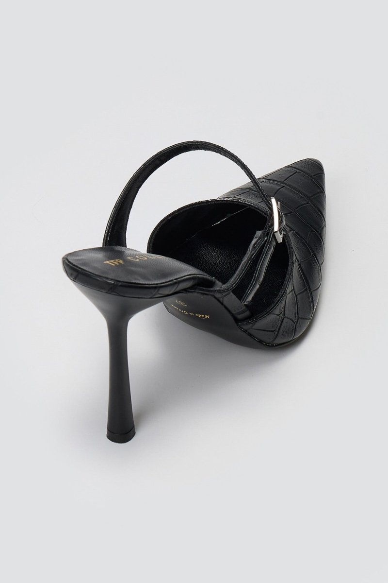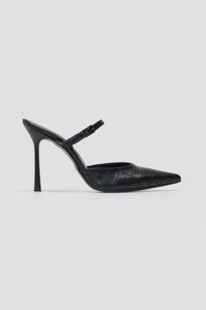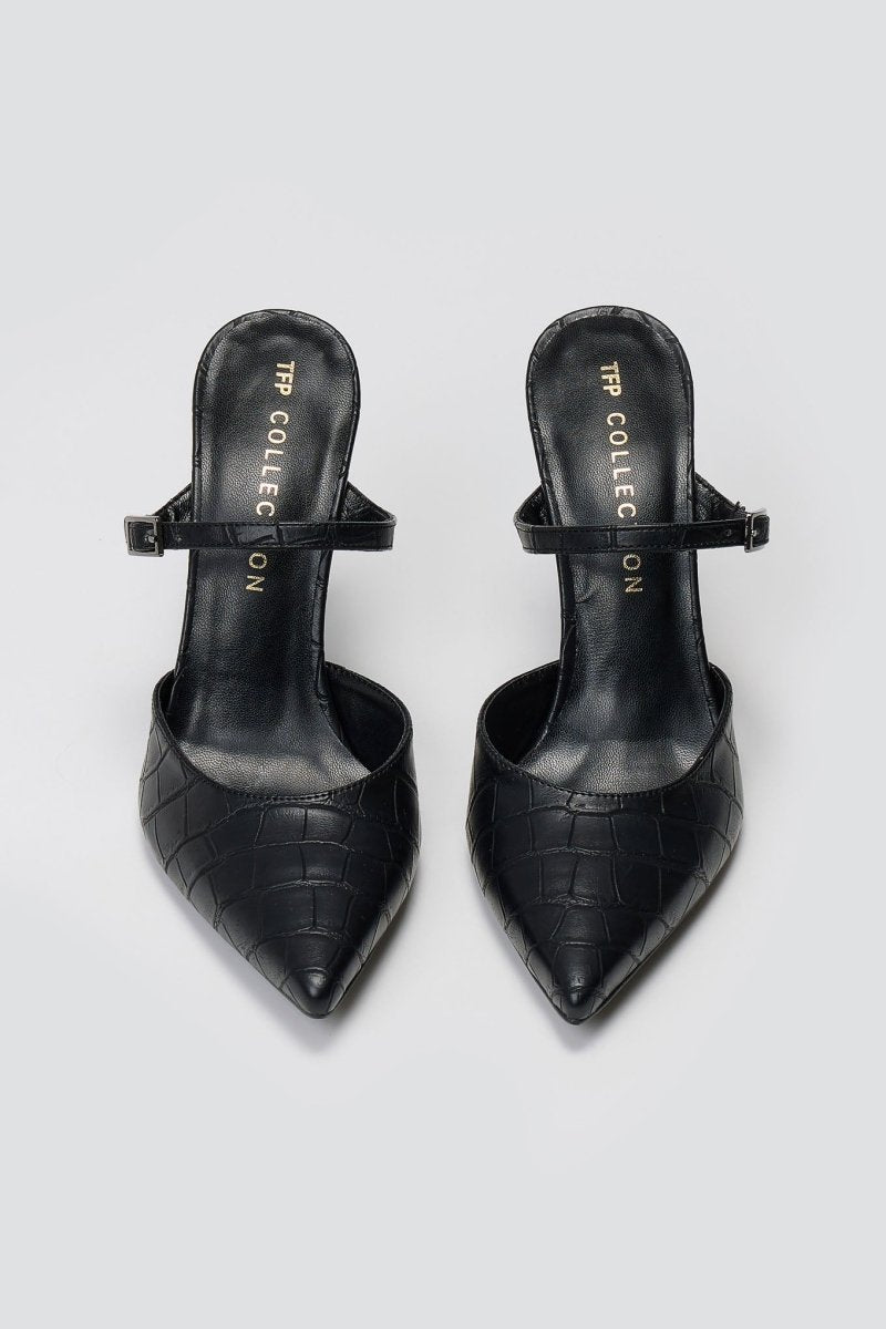 Στιλέτο mules με croc σχέδιο και λεπτό λουράκι στο κουντεπιέ για σταθερή εφαρμογή. Κομψή σιλουέτα και μαλακός πάτος προσφέρουν στυλ και άνεση από το πρωί ως το βράδυ.