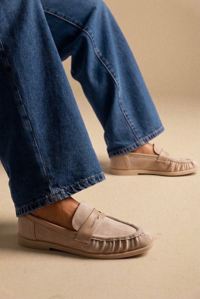 Ideal Shoes presents the Suede Loafers in elegant Taupe Suede, a timeless flat that seamlessly blends sophistication with everyday comfort. Featuring a refined slip-on silhouette with distinctive top strap and ruched apron seam detailing, these loafers are designed for the modern woman who values both style and practicality. Perfect for professional settings, casual outings, or weekend wear, these suede flats deliver versatile elegance.