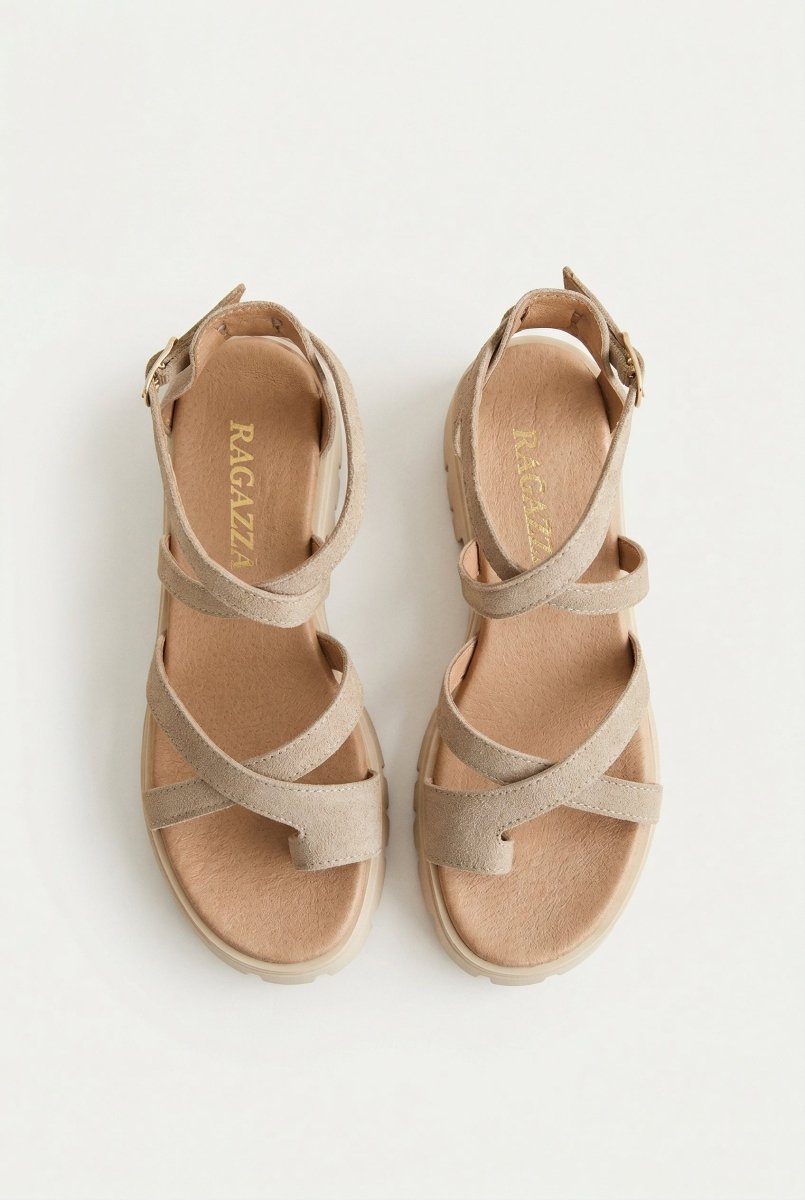 The RAGAZZA Suede Toe Ring Sandals in Beige Suede combine timeless elegance with modern comfort technology. These expertly crafted Greek sandals feature a sophisticated toe ring design paired with a front strap and secure side buckle closure, making them the perfect choice for warm-weather styling. Whether you're heading to the beach, running errands, or enjoying casual outings, these suede sandals deliver both style and functionality for everyday wear.