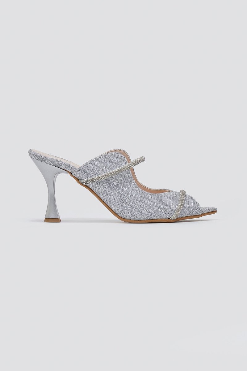Λαμπερές γυναικεία mules από υφασμάτινο glitter με λουράκια διακοσμημένα με στρας και ψηλό τακούνι στιλέτο. Κομψή άνεση για γάμους, πάρτι και βραδινές εμφανίσεις.