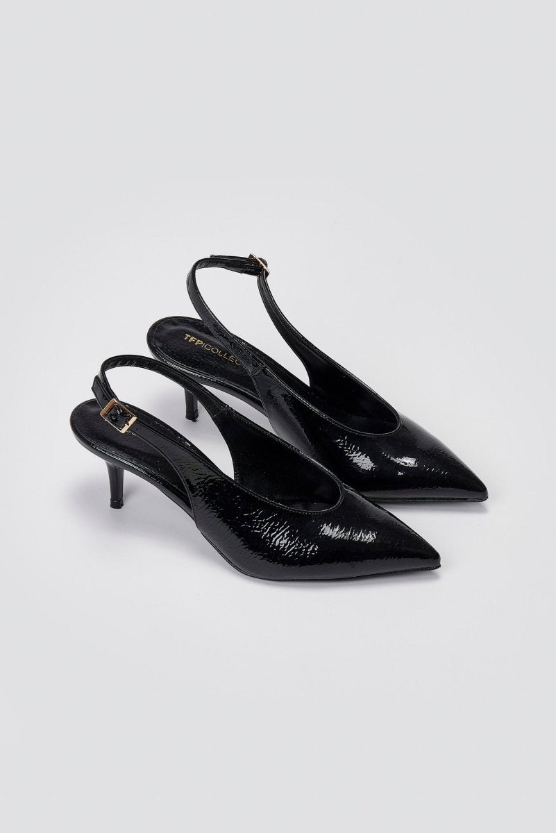Κομψές λουστρίνι γόβες slingback με χαμηλό τακούνι kitten από την TFP, με μυτερή μύτη και πλαϊνό λουράκι. Ελαφριά, μαλακή άνεση και εκλεπτυσμένες γραμμές—ιδανικές από το πρωί μέχρι το βράδυ.