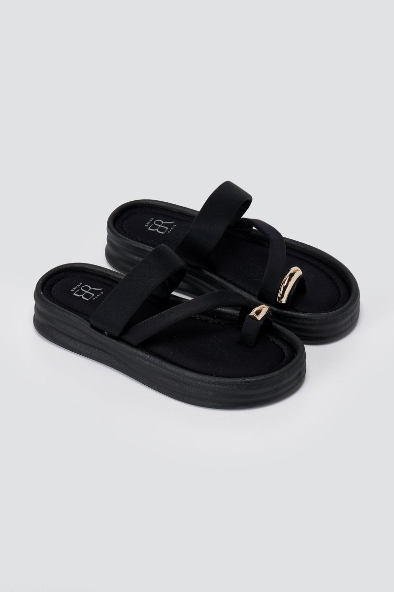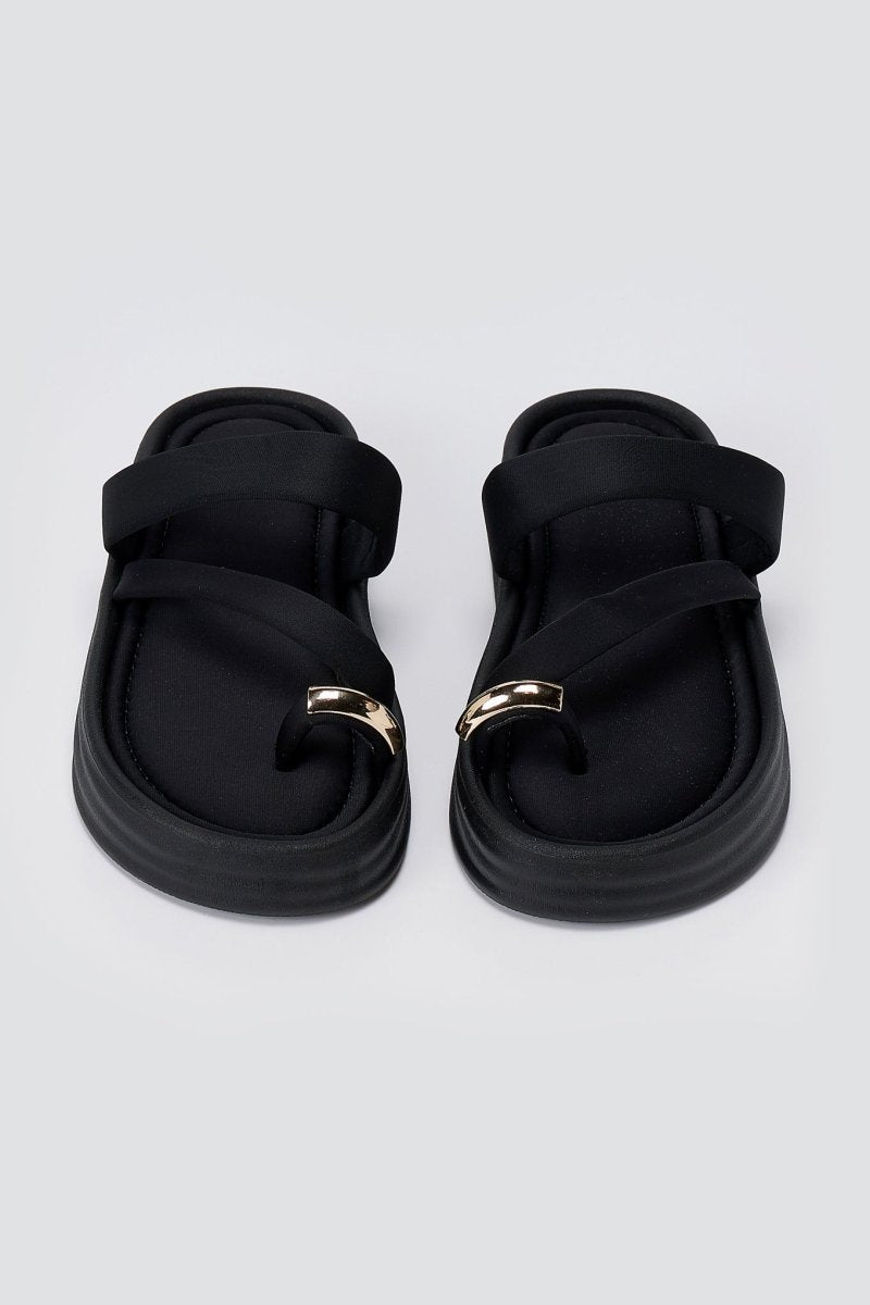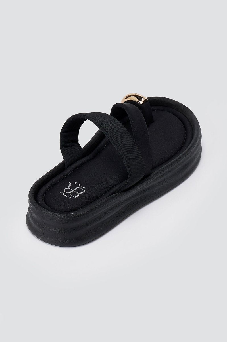 The ERYNN Toe Ring Flatform Sandals in Black Satin offer a sophisticated blend of comfort and contemporary style. Featuring an elegant toe ring design paired with a metallic front detail, these sandals deliver refined summer elegance. The lightweight flatform construction makes them an ideal choice for all-day wear, whether you're heading to casual outings or semi-formal events.