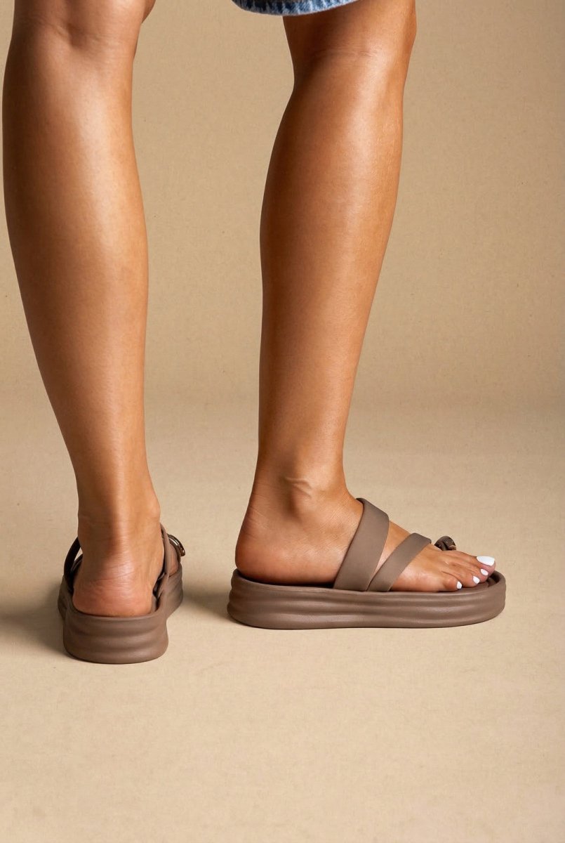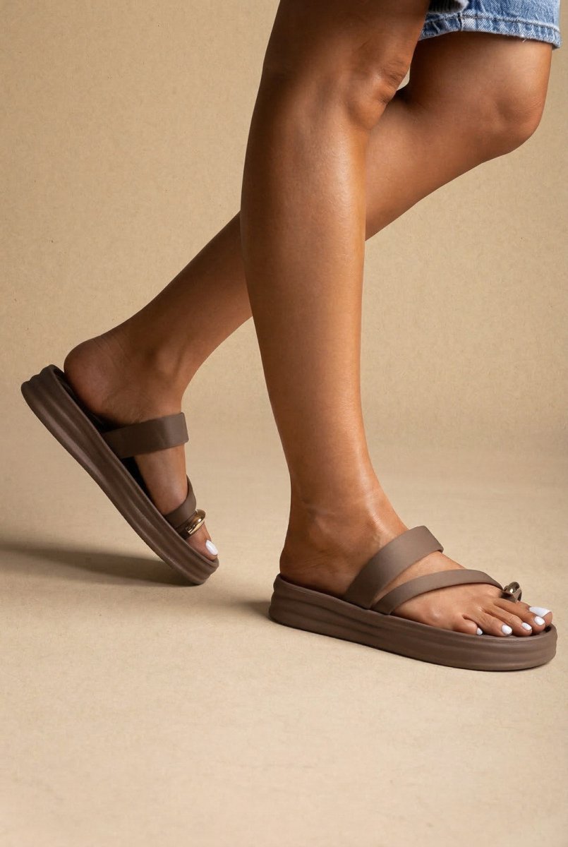The ERYNN Toe Ring Flatform Sandals in Mocha Satin combine contemporary design with everyday comfort. Featuring an elegant toe ring silhouette and eye-catching metallic front detail, these sandals deliver refined summer styling for any occasion. The lightweight flatform construction ensures all-day wearability without compromising on sophistication.