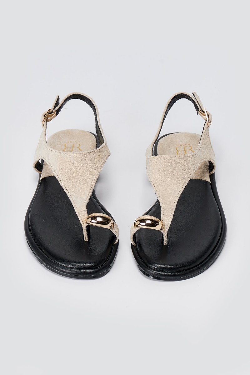 The ERYNN Toe Ring Sandals in Beige Suede combine contemporary style with everyday comfort. Featuring a sophisticated metallic toe accent and secure side strap fastening, these sandals deliver a polished look perfect for summer occasions. The cushioned footbed ensures all-day wearability, making them an ideal choice for those seeking both fashion and function in their warm-weather footwear collection.