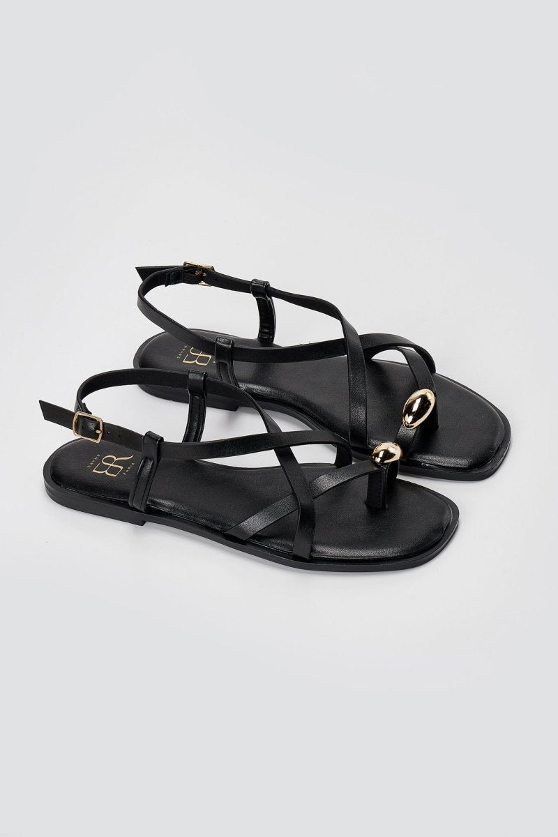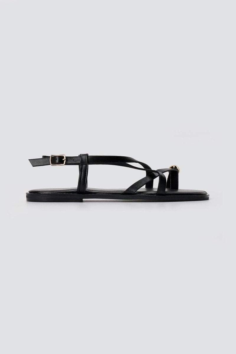 The ERYNN Toe Ring Sandals Metal Detail in Black Matte offer a sophisticated blend of style and comfort for the modern wardrobe. Featuring a striking metallic accent at the front and an adjustable side buckle, these sandals deliver both visual appeal and practical functionality. The sleek black matte finish provides versatility for refined summer styling, making them an essential addition to any seasonal collection.