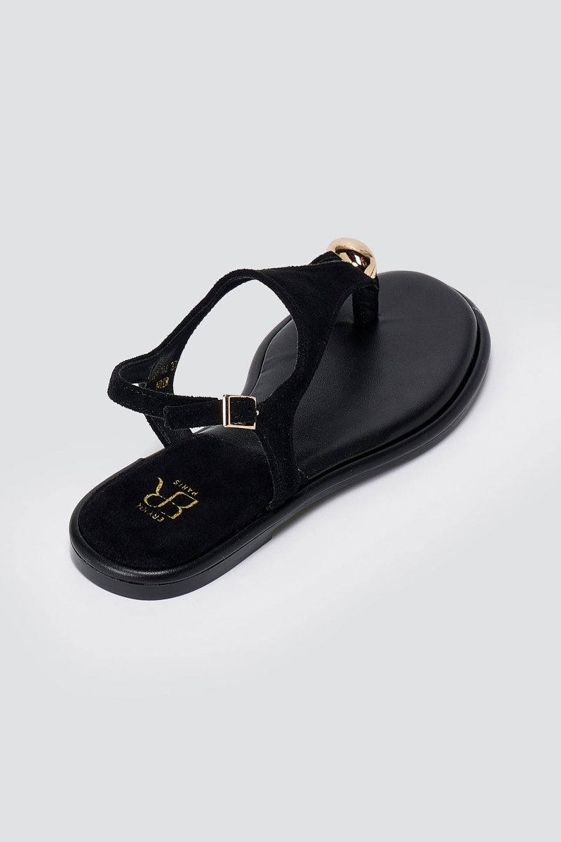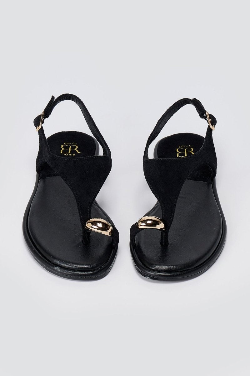 The ERYNN Toe Ring Sandals Metal Detail in Black Suede combine contemporary style with everyday comfort. These versatile sandals feature a sophisticated suede construction enhanced by a striking metallic toe accent, making them an ideal choice for summer wardrobes. The secure side strap fastening ensures a reliable fit, while the cushioned footbed provides all-day wearability for casual outings, beach trips, or relaxed social occasions.