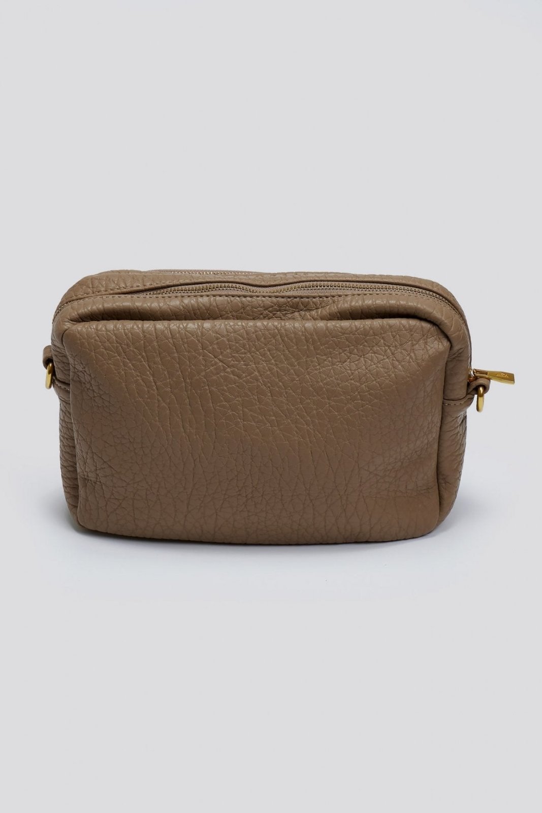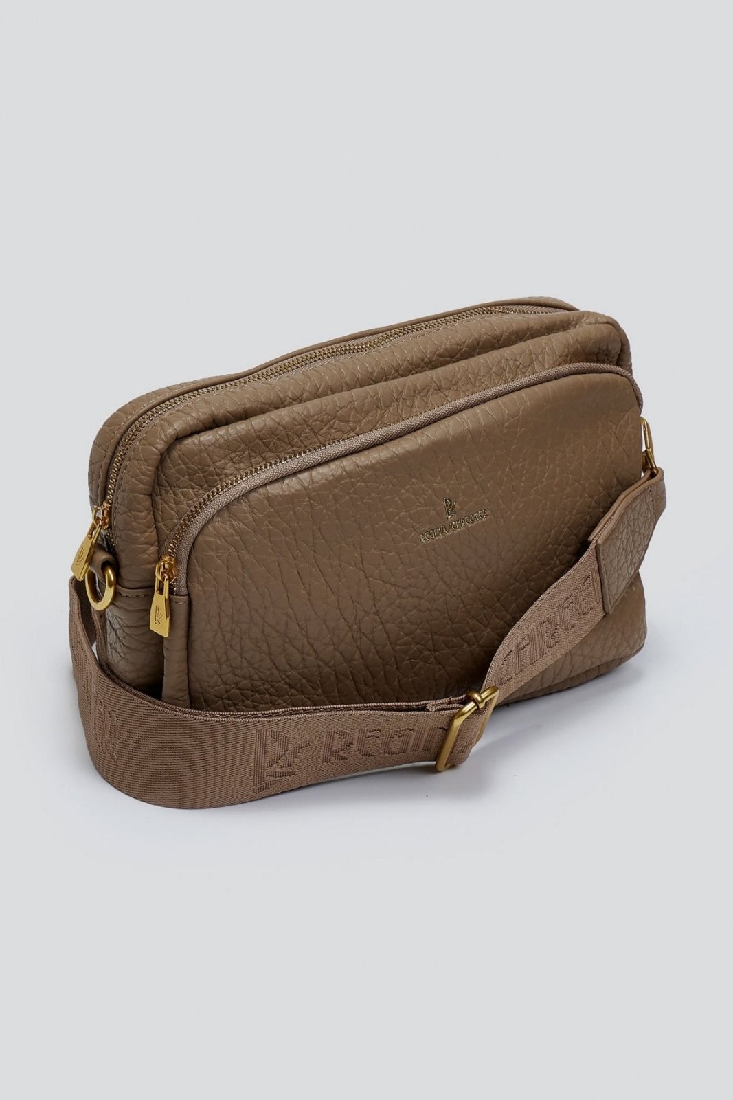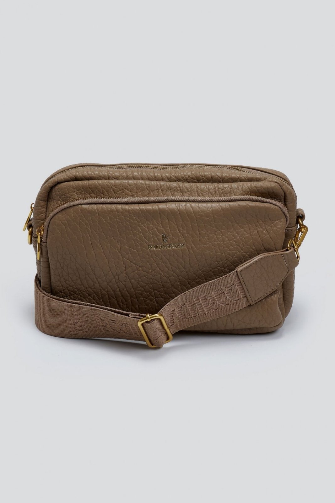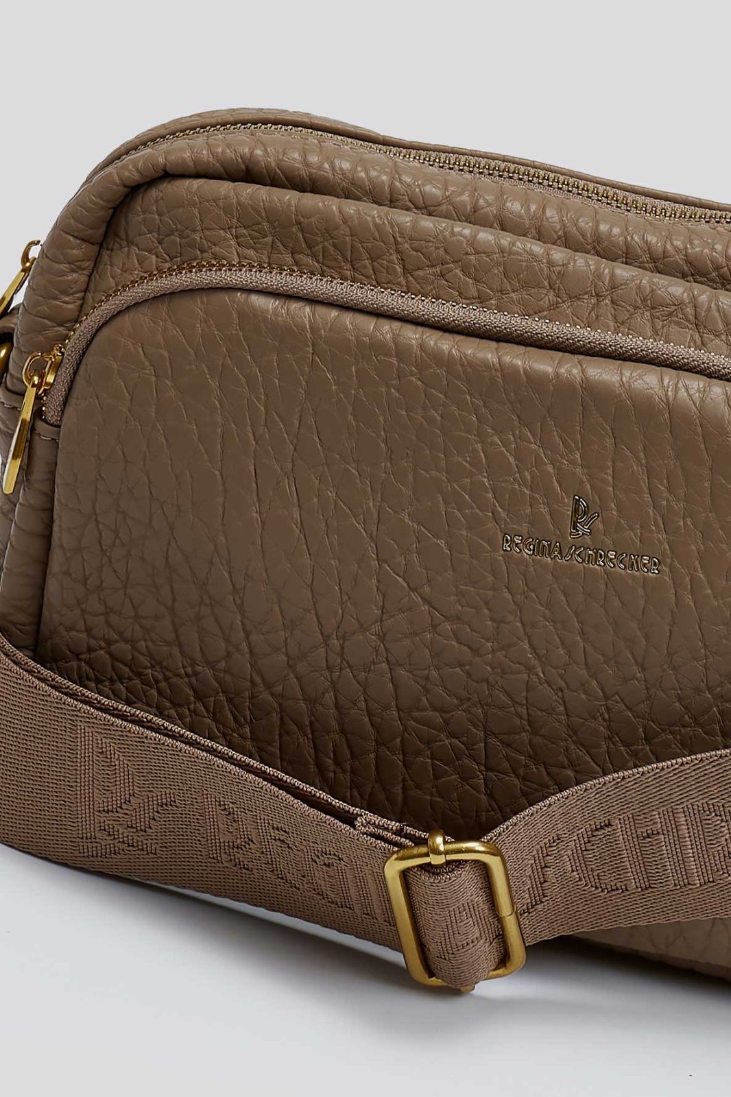 Τσάντα χιαστί με δύο θήκες. Υφασμάτινη επένδυση. Κλείνει με φερμουάρ στο επάνω μέρος. Φαρδύς υφασμάτινος ιμάντας.